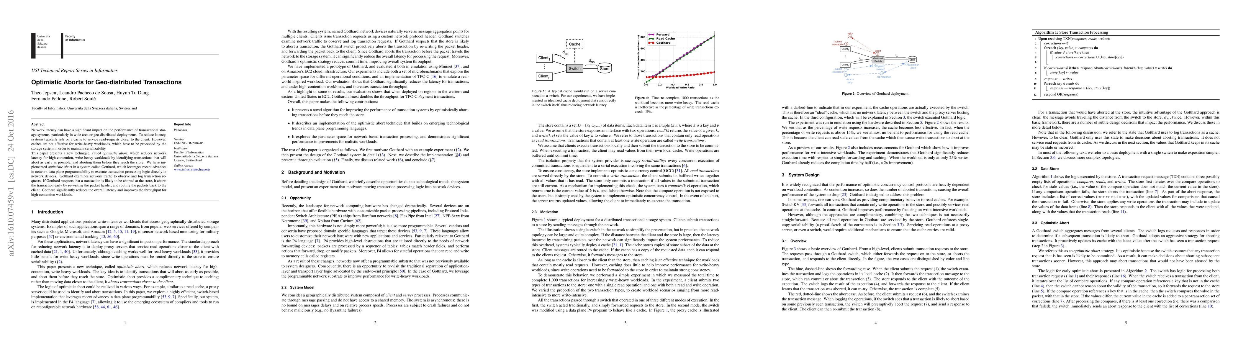 This paper introduces "optimistic abort," a technique to reduce network latency in geo-distributed transactional storage systems by preemptively aborting transactions likely to fail, implemented in the Gotthard system. This approach enhances throughput and reduces latency for high-contention, write-heavy workloads.