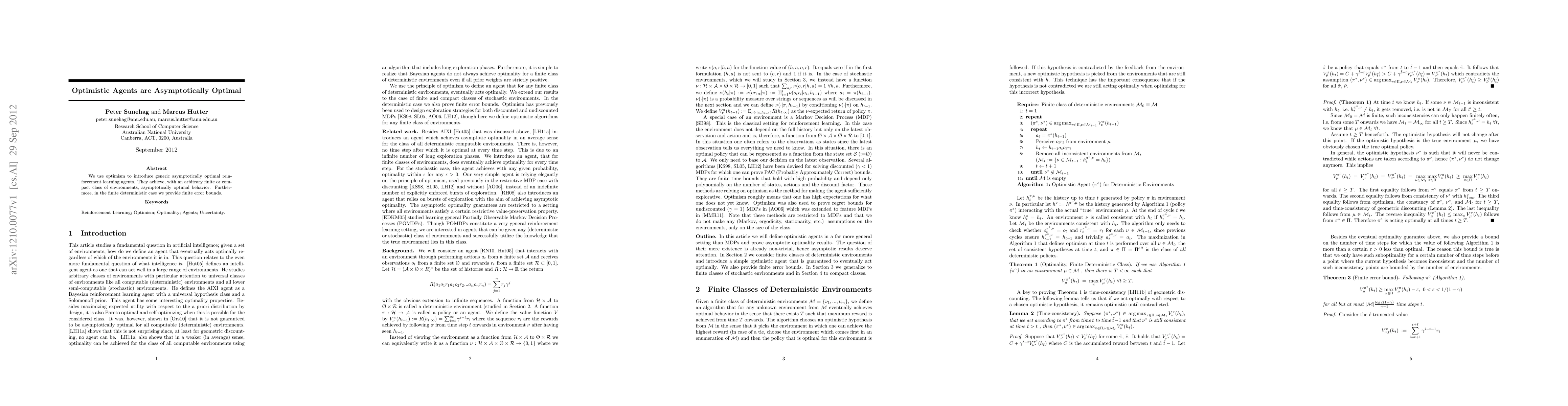 We use optimism to introduce generic asymptotically optimal reinforcement learning agents. They achieve, with an arbitrary finite or compact class of environments, asymptotically optimal behavior. Furthermore, in the finite deterministic case we provide finite error bounds.