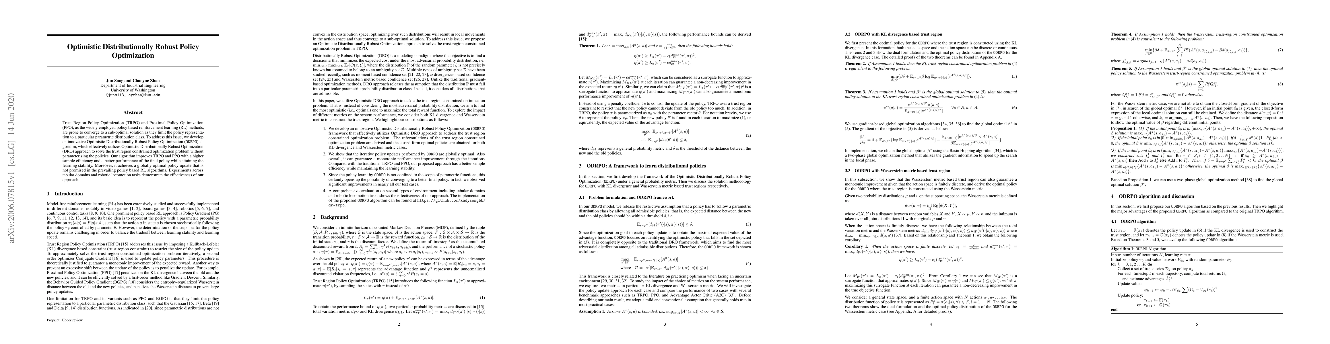 A new optimization algorithm called Optimistic Distributionally Robust Policy Optimization (ODRPO) improves upon existing policy-based reinforcement learning methods by providing a more efficient and stable way of solving trust region constrained optimization problems.