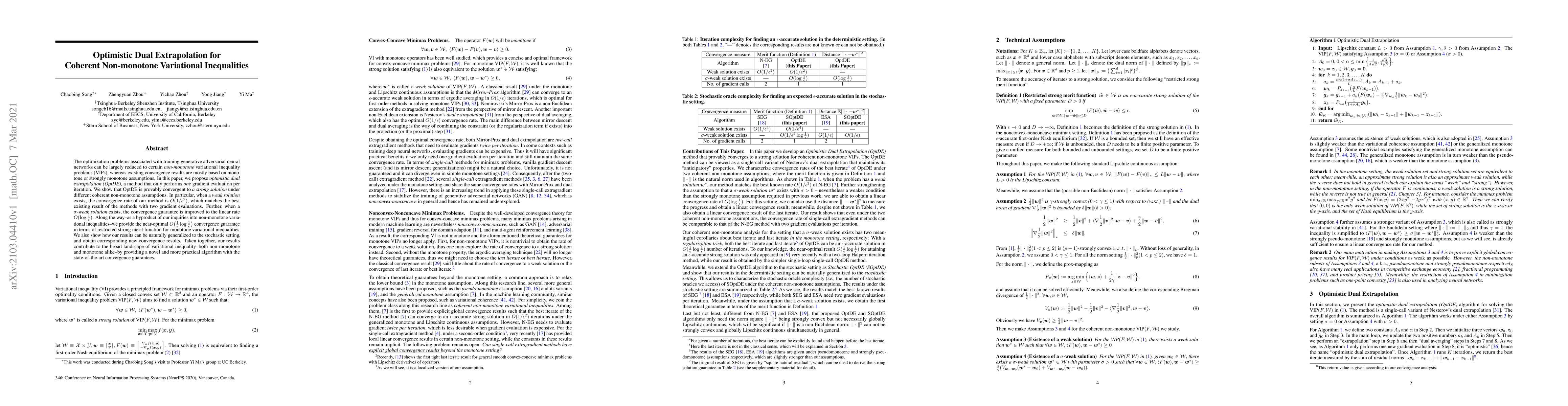 The optimization problems associated with training generative adversarial neural networks can be largely reduced to certain {\em non-monotone} variational inequality problems (VIPs), whereas existing convergence results are mostly based on monotone or strongly monotone assumptions. In this paper, we propose {\em optimistic dual extrapolation (OptDE)}, a method that only performs {\em one} gradient evaluation per iteration. We show that OptDE is provably convergent to {\em a strong solution} under different coherent non-monotone assumptions. In particular, when a {\em weak solution} exists, the convergence rate of our method is $O(1/{\epsilon^{2}})$, which matches the best existing result of the methods with two gradient evaluations. Further, when a {\em $\sigma$-weak solution} exists, the convergence guarantee is improved to the linear rate $O(\log\frac{1}{\epsilon})$. Along the way--as a byproduct of our inquiries into non-monotone variational inequalities--we provide the near-optimal $O\big(\frac{1}{\epsilon}\log \frac{1}{\epsilon}\big)$ convergence guarantee in terms of restricted strong merit function for monotone variational inequalities. We also show how our results can be naturally generalized to the stochastic setting, and obtain corresponding new convergence results. Taken together, our results contribute to the broad landscape of variational inequality--both non-monotone and monotone alike--by providing a novel and more practical algorithm with the state-of-the-art convergence guarantees.