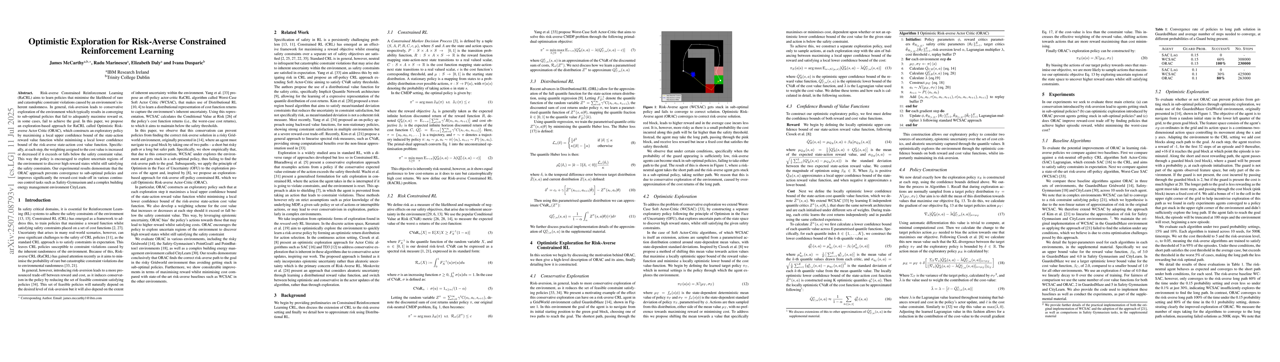 Risk-averse Constrained Reinforcement Learning (RaCRL) aims to learn policies that minimise the likelihood of rare and catastrophic constraint violations caused by an environment's inherent randomness. In general, risk-aversion leads to conservative exploration of the environment which typically results in converging to sub-optimal policies that fail to adequately maximise reward or, in some cases, fail to achieve the goal. In this paper, we propose an exploration-based approach for RaCRL called Optimistic Risk-averse Actor Critic (ORAC), which constructs an exploratory policy by maximising a local upper confidence bound of the state-action reward value function whilst minimising a local lower confidence bound of the risk-averse state-action cost value function. Specifically, at each step, the weighting assigned to the cost value is increased or decreased if it exceeds or falls below the safety constraint value. This way the policy is encouraged to explore uncertain regions of the environment to discover high reward states whilst still satisfying the safety constraints. Our experimental results demonstrate that the ORAC approach prevents convergence to sub-optimal policies and improves significantly the reward-cost trade-off in various continuous control tasks such as Safety-Gymnasium and a complex building energy management environment CityLearn.