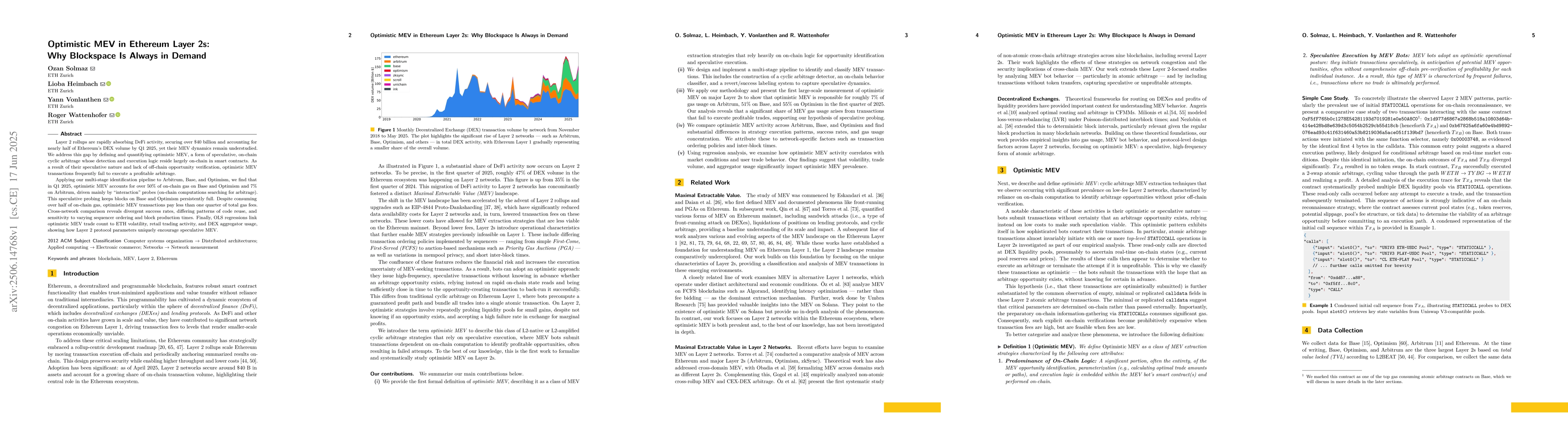This research examines optimistic MEV (Miner Extractable Value) in Ethereum Layer 2s, finding it accounts for over 50% of on-chain gas on Base and Optimism, and 7% on Arbitrum. Optimistic MEV, driven by speculative on-chain arbitrage probes, keeps blocks persistently full, yet pays less than a quarter of total gas fees. Cross-network comparisons reveal varying success rates and sensitivities to sequencer parameters, with OLS regressions linking MEV trade count to ETH volatility and DEX aggregator usage.