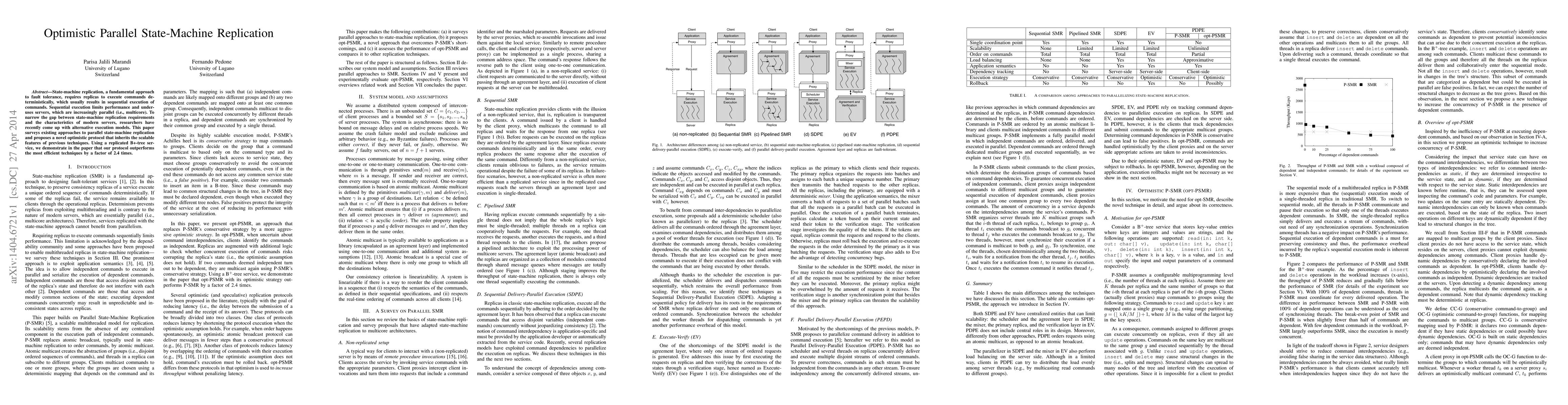 This paper surveys existing parallel state-machine replication methods and introduces an optimistic protocol that enhances scalability. The proposed protocol demonstrates a 2.4x performance improvement over current techniques using a replicated B+-tree service.