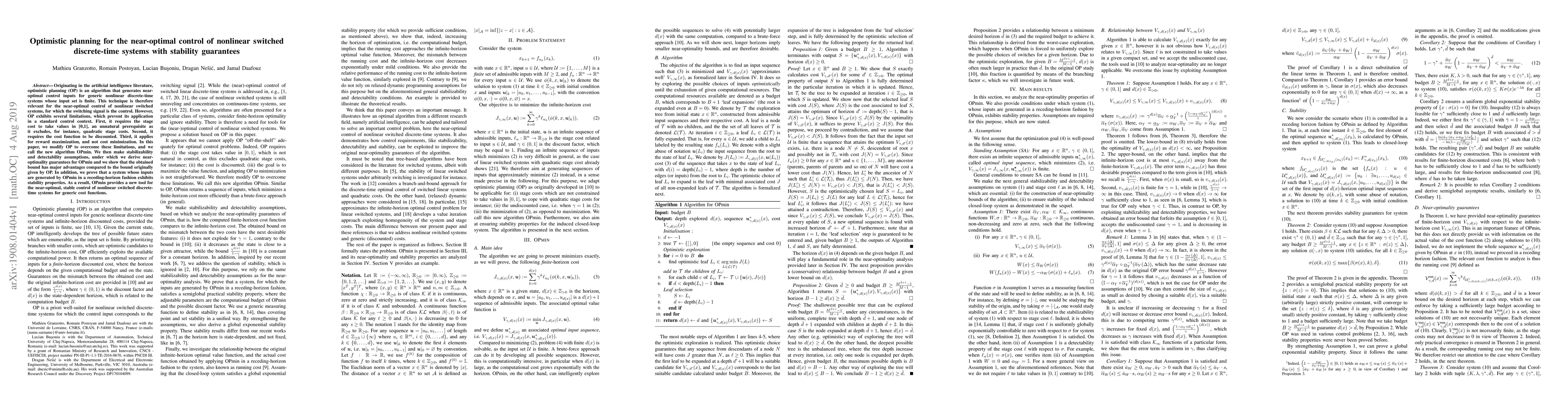 This paper modifies optimistic planning (OP) to create OPmin, addressing its limitations for nonlinear switched discrete-time systems. OPmin overcomes constraints like cost function discounting and stage cost range, providing near-optimal control with stability guarantees for generic cost functions.