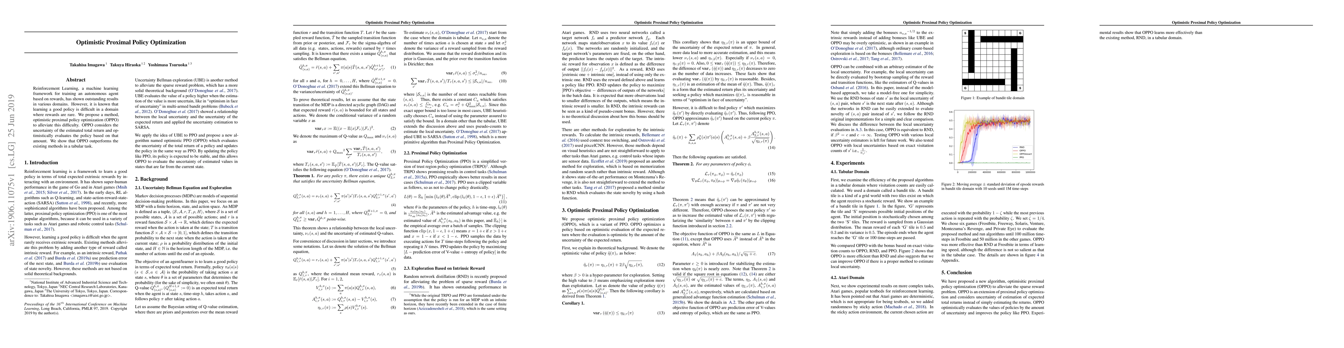 Title: Optimistic Proximal Policy Optimization Summary: This paper proposes the optimistic proximal policy optimization (OPPO) method to improve reinforcement learning in environments with sparse rewards. OPPO evaluates policies optimistically based on estimated return uncertainty, demonstrating superior performance over existing methods in tabular tasks.
