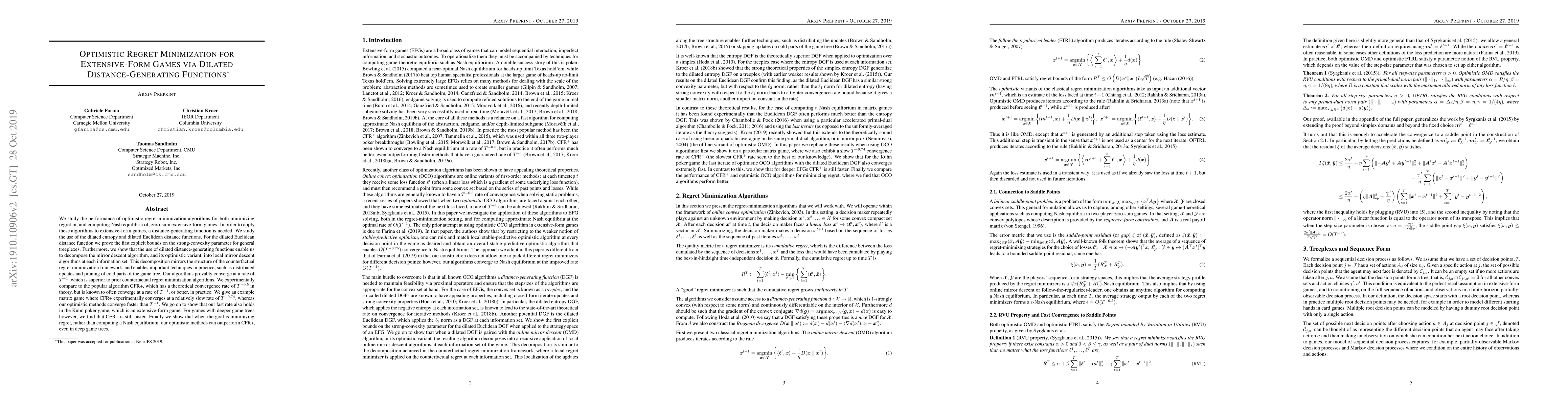 This paper proposes optimistic regret-minimization algorithms for zero-sum extensive-form games, utilizing dilated distance-generating functions. The authors demonstrate faster convergence rates compared to existing methods, particularly in scenarios where regret minimization is the primary goal, and highlight practical benefits like distributed updates and pruning.