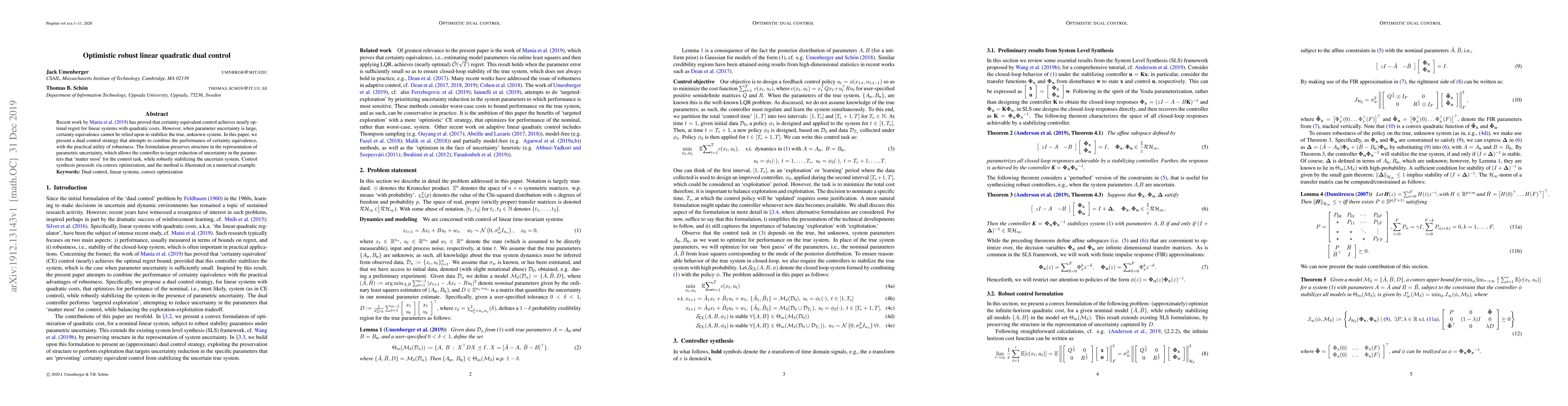 Recent work by Mania et al. has proved that certainty equivalent control achieves nearly optimal regret for linear systems with quadratic costs. However, when parameter uncertainty is large, certainty equivalence cannot be relied upon to stabilize the true, unknown system. In this paper, we present a dual control strategy that attempts to combine the performance of certainty equivalence, with the practical utility of robustness. The formulation preserves structure in the representation of parametric uncertainty, which allows the controller to target reduction of uncertainty in the parameters that `matter most' for the control task, while robustly stabilizing the uncertain system. Control synthesis proceeds via convex optimization, and the method is illustrated on a numerical example.