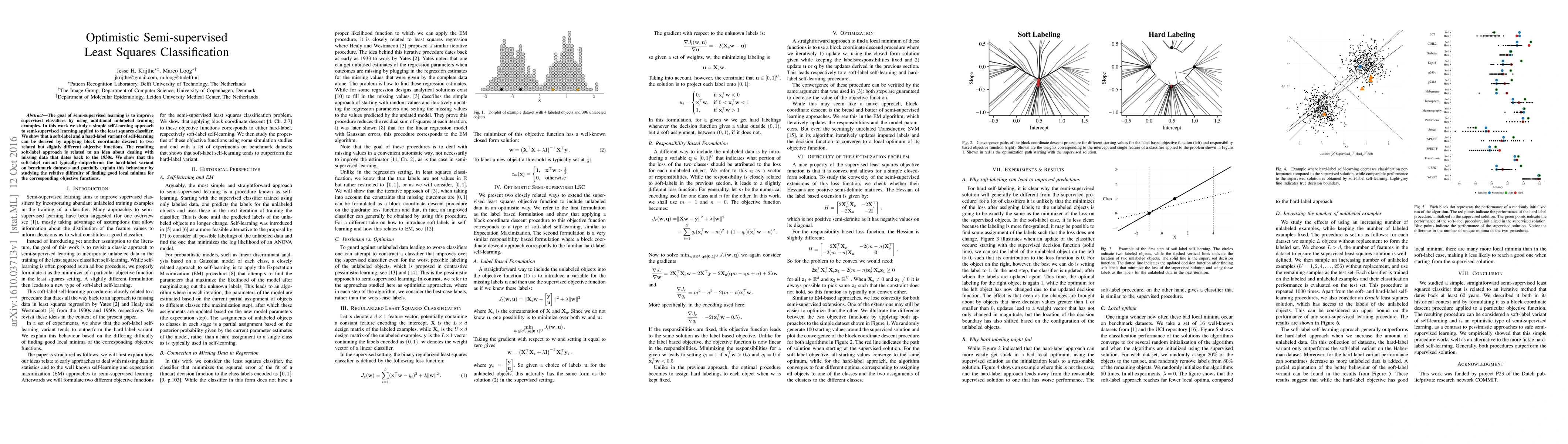 The goal of semi-supervised learning is to improve supervised classifiers by using additional unlabeled training examples. In this work we study a simple self-learning approach to semi-supervised learning applied to the least squares classifier. We show that a soft-label and a hard-label variant of self-learning can be derived by applying block coordinate descent to two related but slightly different objective functions. The resulting soft-label approach is related to an idea about dealing with missing data that dates back to the 1930s. We show that the soft-label variant typically outperforms the hard-label variant on benchmark datasets and partially explain this behaviour by studying the relative difficulty of finding good local minima for the corresponding objective functions.