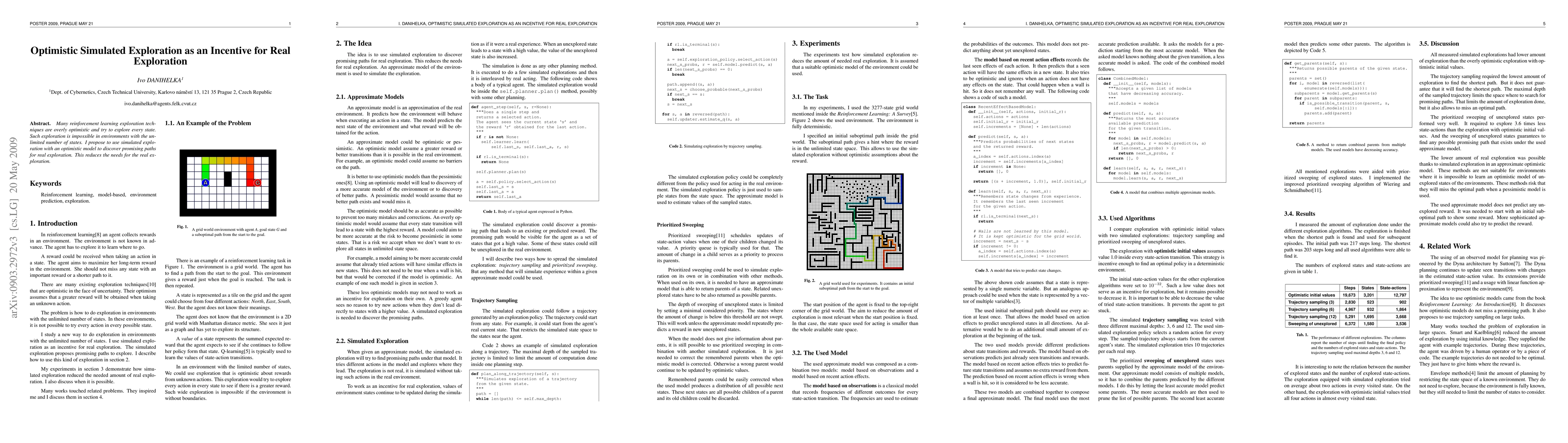 A new approach to exploration in unlimited statespaces was proposed, using a simulated exploration and an optimistic model of the environment.