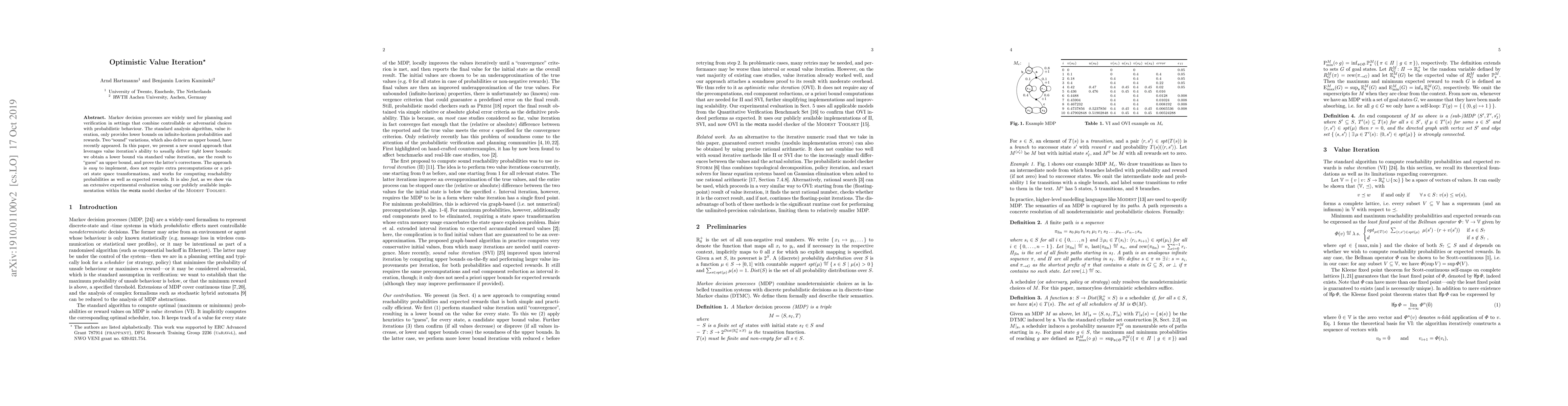 This paper introduces optimistic value iteration, a new method for analyzing Markov decision processes that provides both a lower and an upper bound on probabilities and rewards. It leverages standard value iteration for tight lower bounds and uses this to "guess" an upper bound, proving its correctness, and demonstrates its efficiency and ease of implementation through experiments.