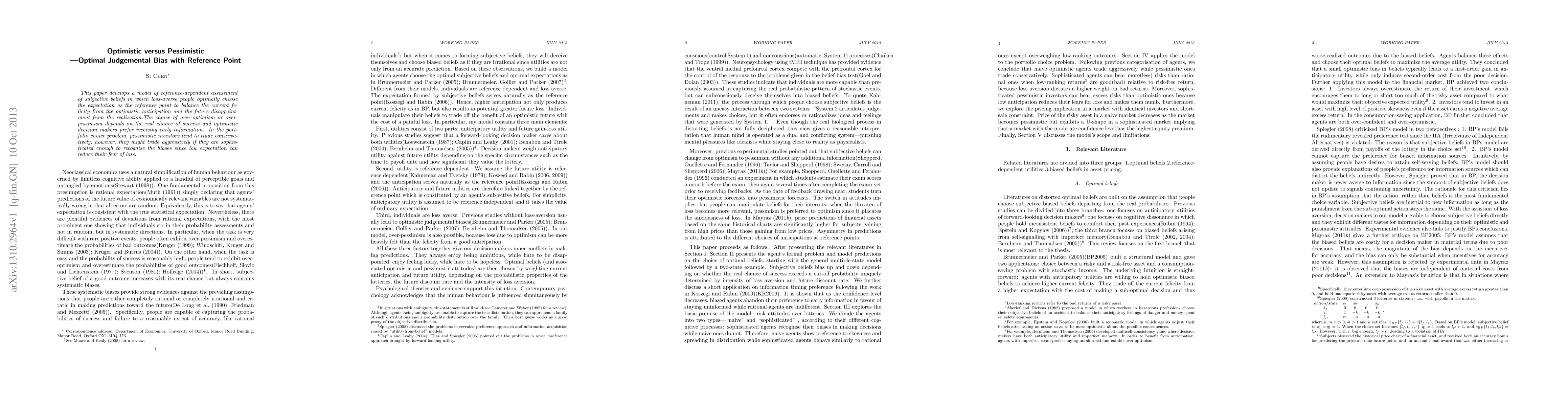 This paper develops a model of reference-dependent assessment of subjective beliefs in which loss-averse people optimally choose the expectation as the reference point to balance the current felicity from the optimistic anticipation and the future disappointment from the realisation. The choice of over-optimism or over-pessimism depends on the real chance of success and optimistic decision makers prefer receiving early information. In the portfolio choice problem, pessimistic investors tend to trade conservatively, however, they might trade aggressively if they are sophisticated enough to recognise the biases since low expectation can reduce their fear of loss.