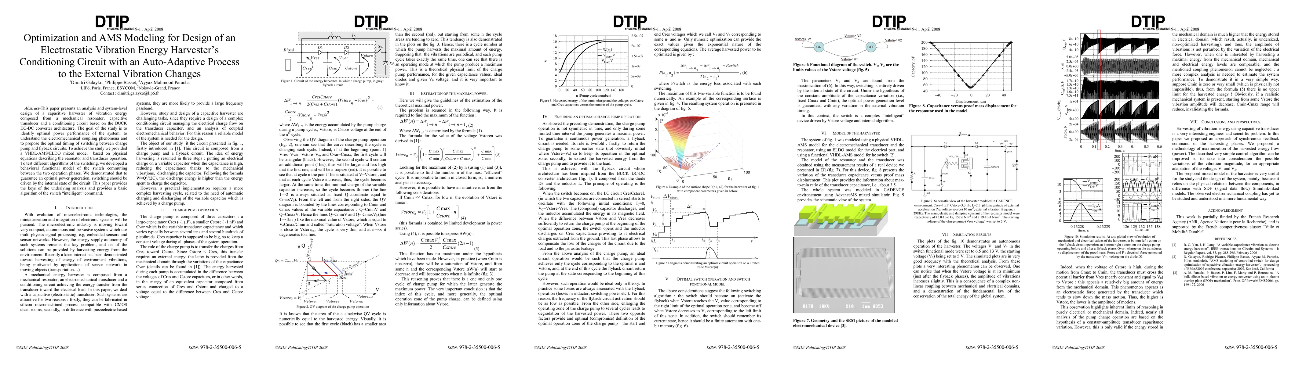 Electrostatic transducers for vibration energy scavenging have been an object to numerous studies, but are still facing major issues relating to their conditioning circuit. One of the most popular ones uses a charge pump and a flyback circuit based on a Buck DC-DC converter (Fig. 1). A commutation between the energy accumulation in the charge pump and the recharge of the buffer capacitor Cres is assured by a switch which is the major bottleneck in the energy harvester circuit. The commutation timing of the switch determines the efficiency of the energy harvesting. In previous papers [1] the switch commutates periodically with some fixed duty ratio. However, this solution is not appropriate when the environment parameters, e.g. the vibration frequency, change. We found that the switching should be ordered by the internal state of the circuit, an not by some fixed timing scenario. We presents how to find the optimal operation mode of the harvester. To validate the study, the system was modeled using a mixed VHDL-AMS - ELDO model.