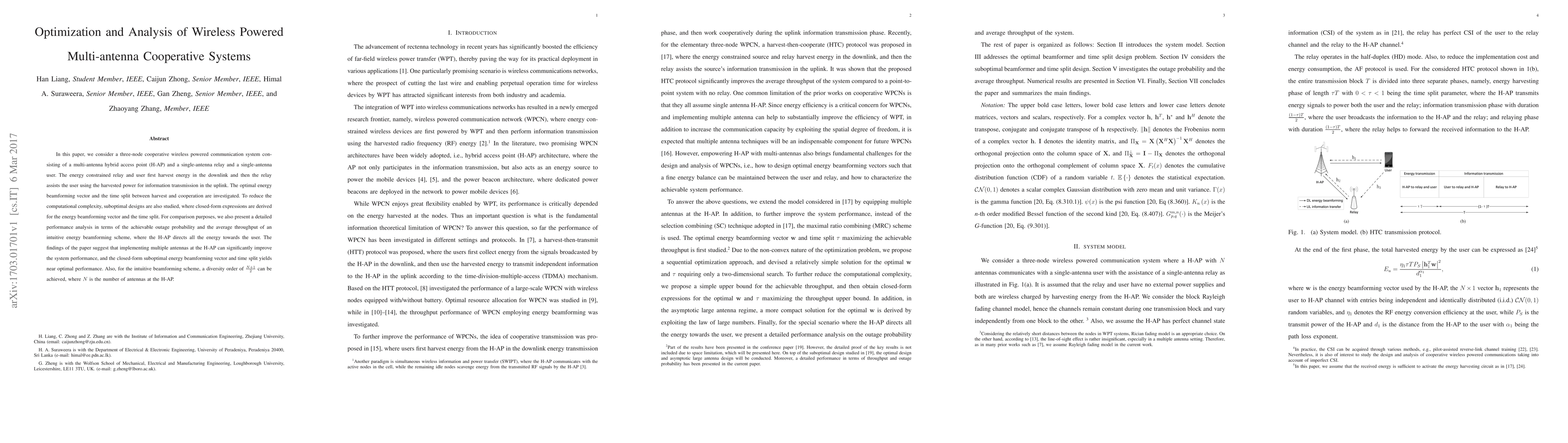 This paper optimizes a wireless powered multi-antenna cooperative system with a hybrid access point, relay, and user, focusing on energy beamforming and time allocation. It finds that using multiple antennas at the access point enhances performance, and suboptimal designs provide near-optimal results.