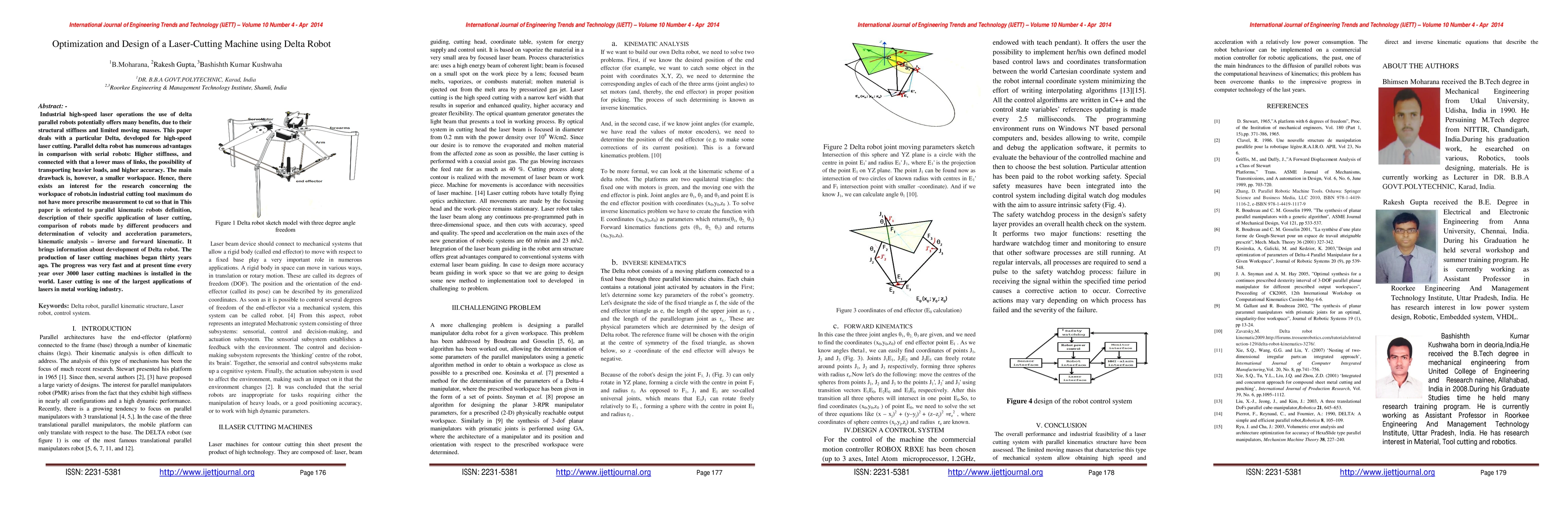 Industrial high speed laser operations the use of delta parallel robots potentially offers many benefits due to their structural stiffness and limited moving masses. This paper deals with a particular Delta, developed for high speed laser cutting. Parallel delta robot has numerous advantages in comparison with serial robots Higher stiffness and connected with that a lower mass of links the possibility of transporting heavier loads, and higher accuracy. The main drawback is however a smaller workspace. Hence there exists an interest for the research concerning the workspace of robots.In industrial cutting tool maximum do not have more prescribe measurement to cut so that in This paper is oriented to parallel kinematic robots definition description of their specific application of laser cutting comparison of robots made by different producers and determination of velocity and acceleration parameters kinematic analysis inverse and forward kinematic. It brings information about development of Delta robot. The production of laser cutting machines began thirty years ago. The progress was very fast and at present time every year over 3000 laser cutting machines is installed in the world. Laser cutting is one of the largest applications of lasers in metal working industry.