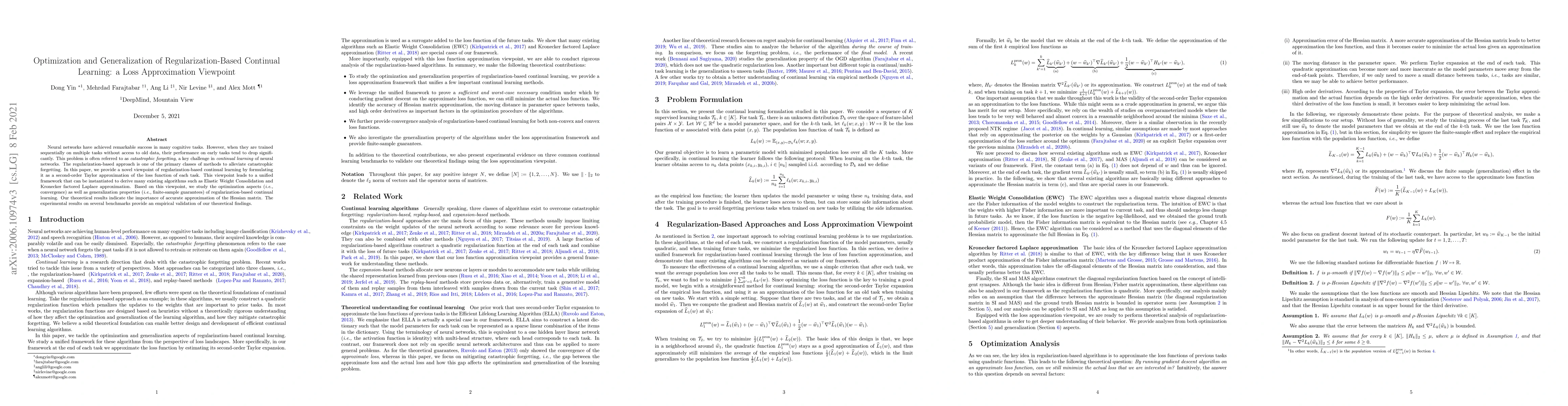 The paper presents a unified framework for regularization-based continual learning based on loss function approximation, providing theoretical guarantees for optimization and generalization.
