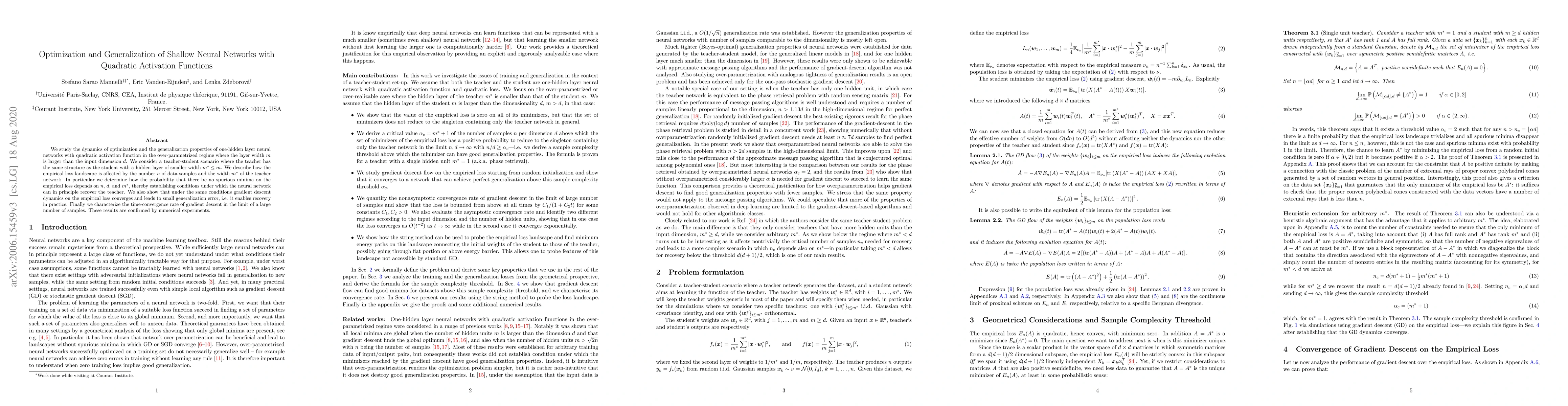 Researchers studied how neural networks with quadratic activation functions learn from data and generalize well, finding that a specific teacher-student setup can lead to accurate recovery of the teacher's parameters.