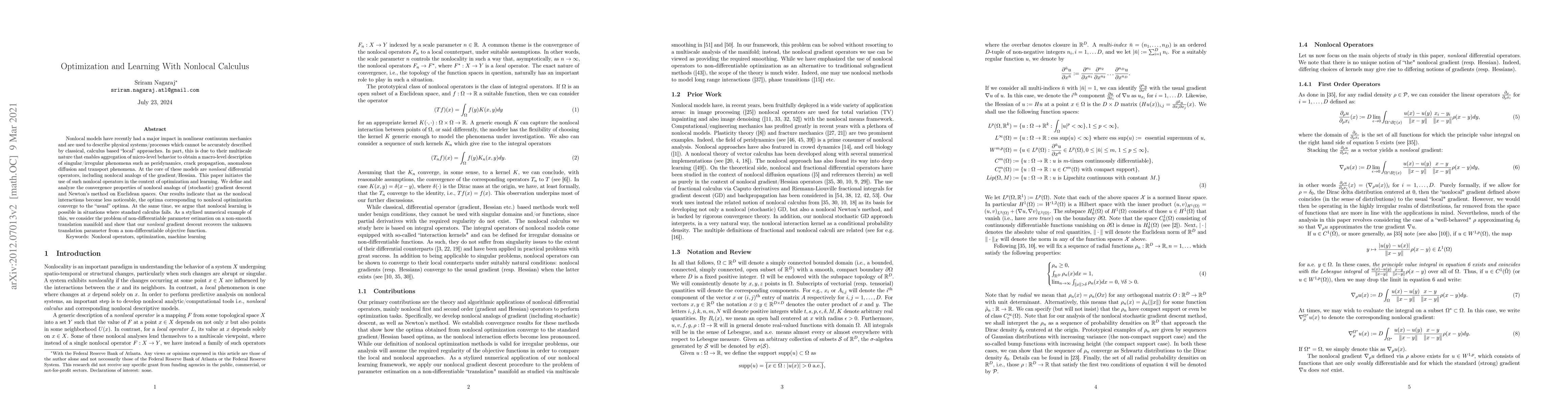 This paper explores the application of nonlocal calculus in optimization and learning, introducing nonlocal analogs of gradient descent and Newton's methods. It demonstrates that nonlocal optimization converges to traditional methods when local interactions dominate, while also showing that nonlocal approaches can effectively handle problems where standard calculus fails, exemplified by recovering translation parameters from non-differentiable functions.