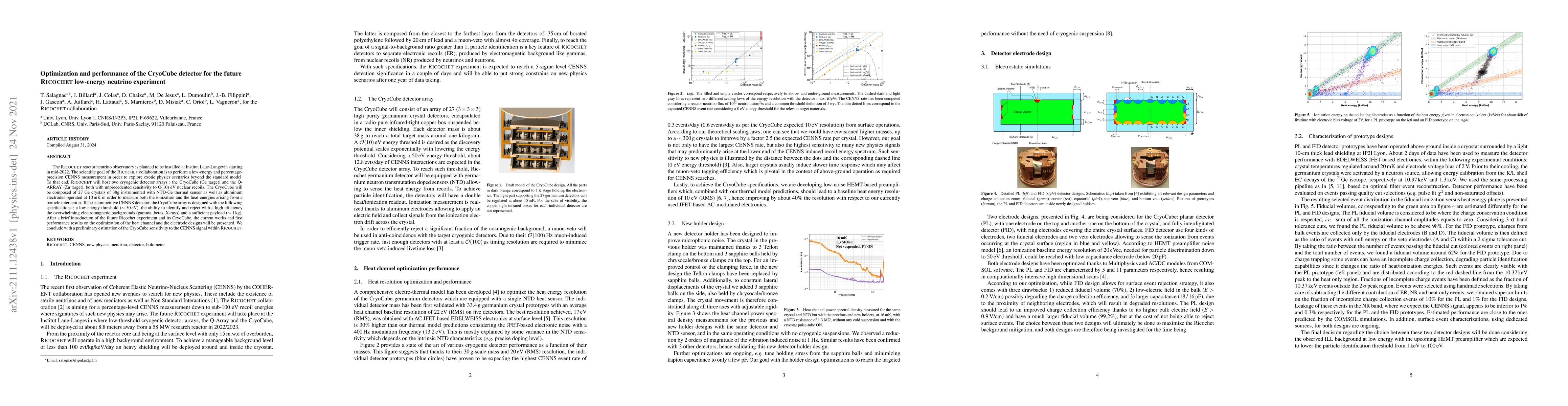 The RICOCHET reactor neutrino observatory is planned to be installed at Institut Laue-Langevin starting in mid-2022. The scientific goal of the RICOCHET collaboration is to perform a low-energy and percentage-precision CENNS measurement in order to explore exotic physics scenarios beyond the standard model. To that end, RICOCHET will host two cryogenic detector arrays : the CryoCube (Ge target) and the Q-ARRAY (Zn target), both with unprecedented sensitivity to O(10)eV nuclear recoils. The CryoCube will be composed of 27 Ge crystals of 38g instrumented with NTD-Ge thermal sensor as well as aluminum electrodes operated at 10mK in order to measure both the ionization and the heat energies arising from a particle interaction. To be a competitive CENNS detector, the CryoCube array is designed with the following specifications : a low energy threshold ($\sim 50$eV), the ability to identify and reject with a high efficiency the overwhelming electromagnetic backgrounds (gamma, betas, X-rays) and a sufficient payload ($\sim 1$kg). After a brief introduction of the future RICOCHET experiment and its CryoCube, the current works and first performance results on the optimization of the heat channel and the electrode designs will be presented. We conclude with a preliminary estimation of the CryoCube sensitivity to the CENNS signal within RICOCHET.