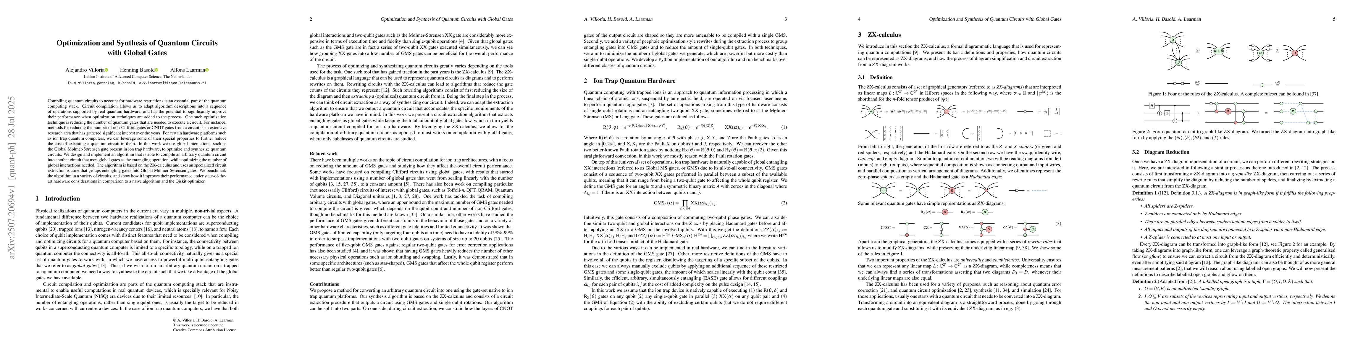 Compiling quantum circuits to account for hardware restrictions is an essential part of the quantum computing stack. Circuit compilation allows us to adapt algorithm descriptions into a sequence of operations supported by real quantum hardware, and has the potential to significantly improve their performance when optimization techniques are added to the process. One such optimization technique is reducing the number of quantum gates that are needed to execute a circuit. For instance, methods for reducing the number of non-Clifford gates or CNOT gates from a circuit is an extensive research area that has gathered significant interest over the years. For certain hardware platforms such as ion trap quantum computers, we can leverage some of their special properties to further reduce the cost of executing a quantum circuit in them. In this work we use global interactions, such as the Global M{\o}lmer-S{\o}rensen gate present in ion trap hardware, to optimize and synthesize quantum circuits. We design and implement an algorithm that is able to compile an arbitrary quantum circuit into another circuit that uses global gates as the entangling operation, while optimizing the number of global interactions needed. The algorithm is based on the ZX-calculus and uses an specialized circuit extraction routine that groups entangling gates into Global M{\o}lmer-S{\o}rensen gates. We benchmark the algorithm in a variety of circuits, and show how it improves their performance under state-of-the-art hardware considerations in comparison to a naive algorithm and the Qiskit optimizer.
