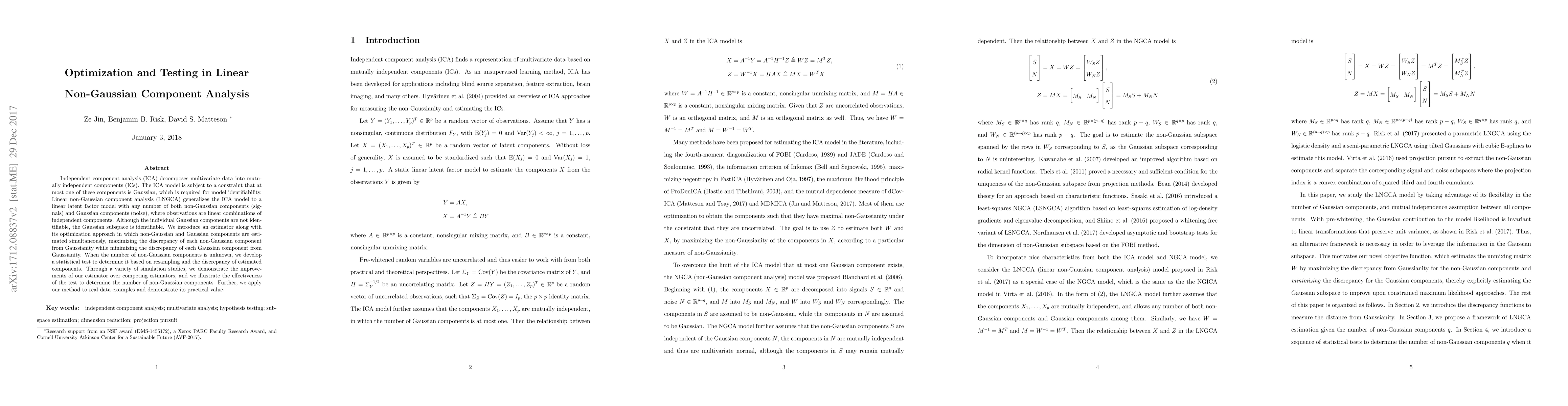 This paper introduces an optimization method for estimating both non-Gaussian and Gaussian components in Linear Non-Gaussian Component Analysis (LNGCA), and a statistical test to determine the number of non-Gaussian components. Simulation studies and real data applications show the method's effectiveness and practical value.