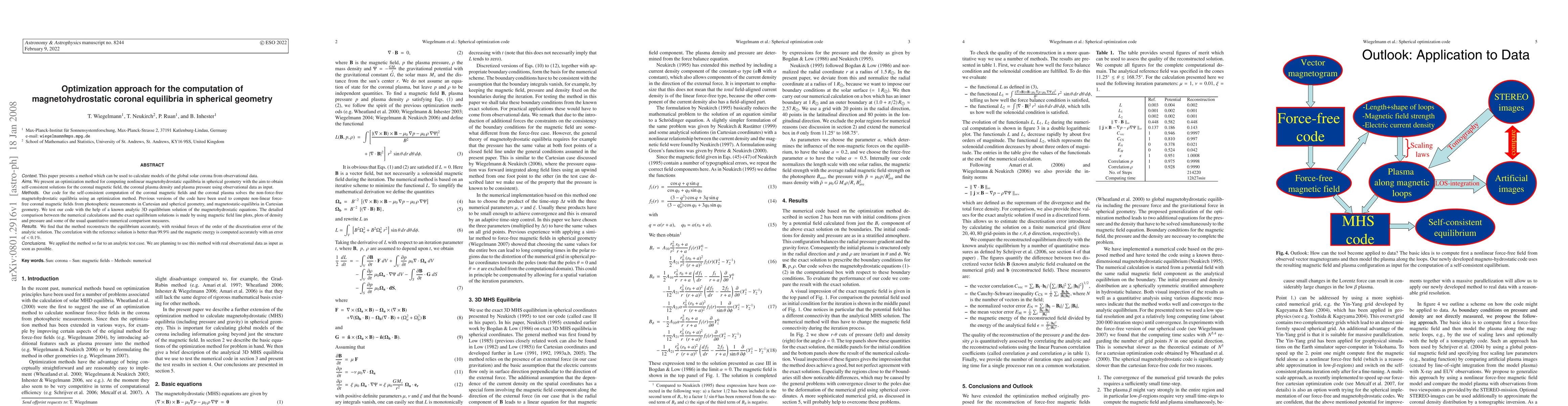 The paper introduces an optimization approach for computing magnetohydrostatic coronal equilibria in spherical geometry, which extends previous work on force-free magnetic fields and magnetostatic equilibria in Cartesian geometry.