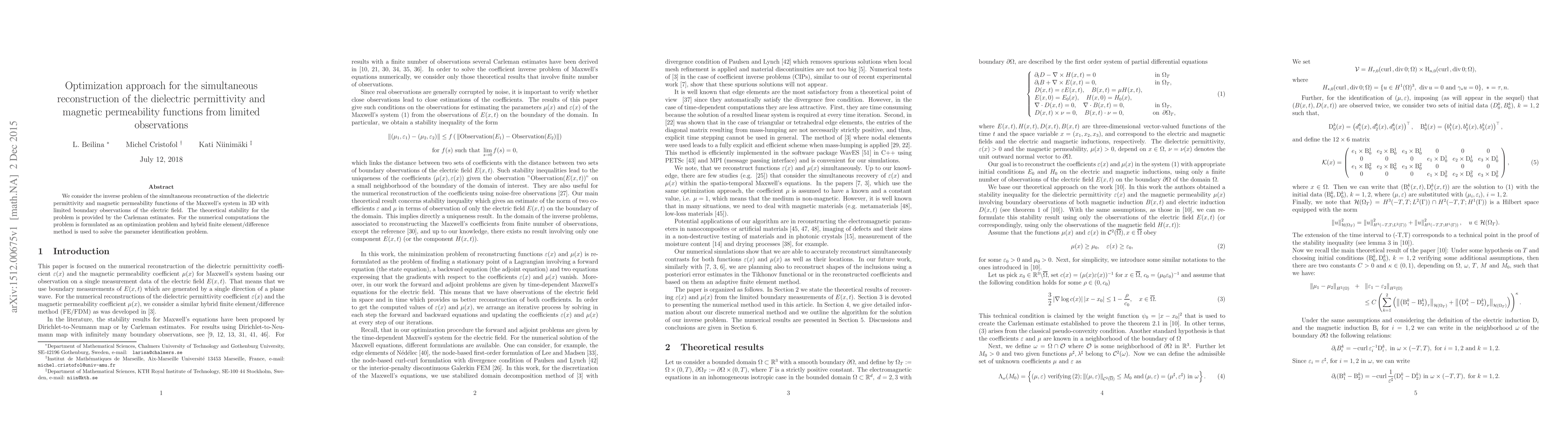 This paper presents an optimization approach for reconstructing the dielectric permittivity and magnetic permeability functions from limited boundary observations of the electric field, employing Carleman estimates for theoretical stability and a hybrid finite element/difference method for numerical solution.