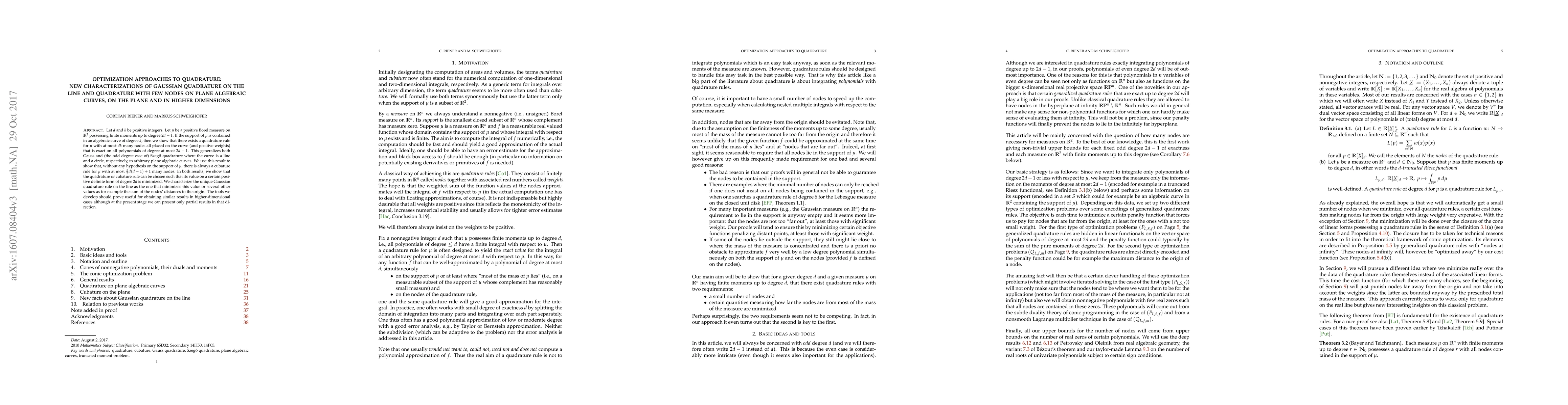This paper presents new optimization methods for Gaussian quadrature, showing that for a measure with finite moments up to degree 2d-1 and support on an algebraic curve of degree k, a quadrature rule with at most dk nodes on the curve can be exact for polynomials up to degree 2d-1. It also proves the existence of a cubature rule with at most 3/2d(d-1)+1 nodes for any measure, minimizing certain positive definite forms of degree 2d. These findings generalize Gauss and Szego quadrature to arbitrary plane algebraic curves, with potential applications in higher dimensions.