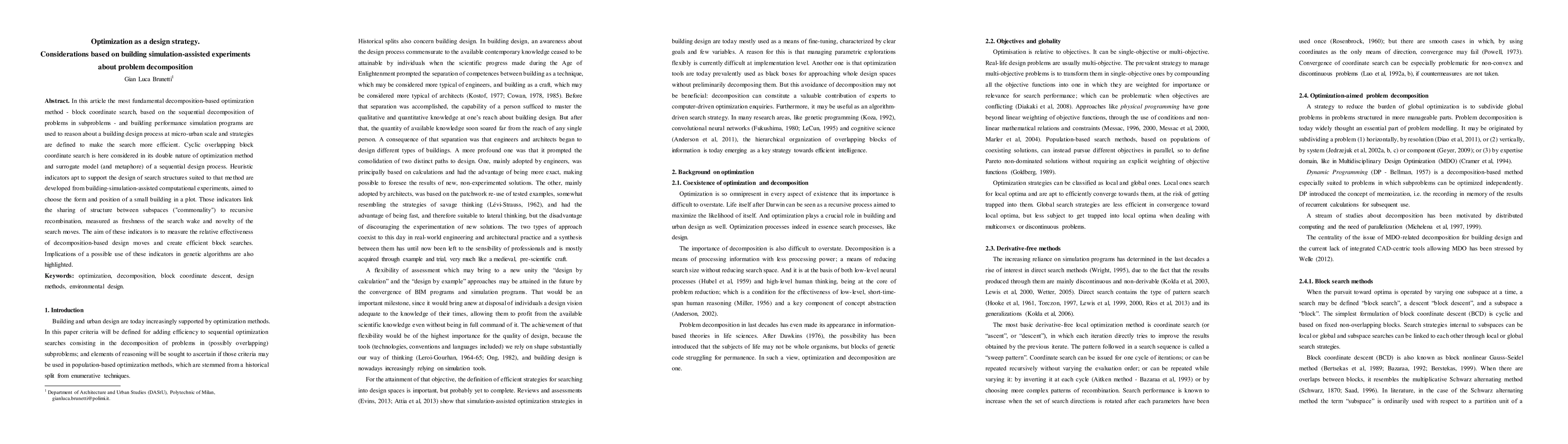 In this article the most fundamental decomposition-based optimization method - block coordinate search, based on the sequential decomposition of problems in subproblems - and building performance simulation programs are used to reason about a building design process at micro-urban scale and strategies are defined to make the search more efficient. Cyclic overlapping block coordinate search is here considered in its double nature of optimization method and surrogate model (and metaphore) of a sequential design process. Heuristic indicators apt to support the design of search structures suited to that method are developed from building-simulation-assisted computational experiments, aimed to choose the form and position of a small building in a plot. Those indicators link the sharing of structure between subspaces ("commonality") to recursive recombination, measured as freshness of the search wake and novelty of the search moves. The aim of these indicators is to measure the relative effectiveness of decomposition-based design moves and create efficient block searches. Implications of a possible use of these indicators in genetic algorithms are also highlighted.