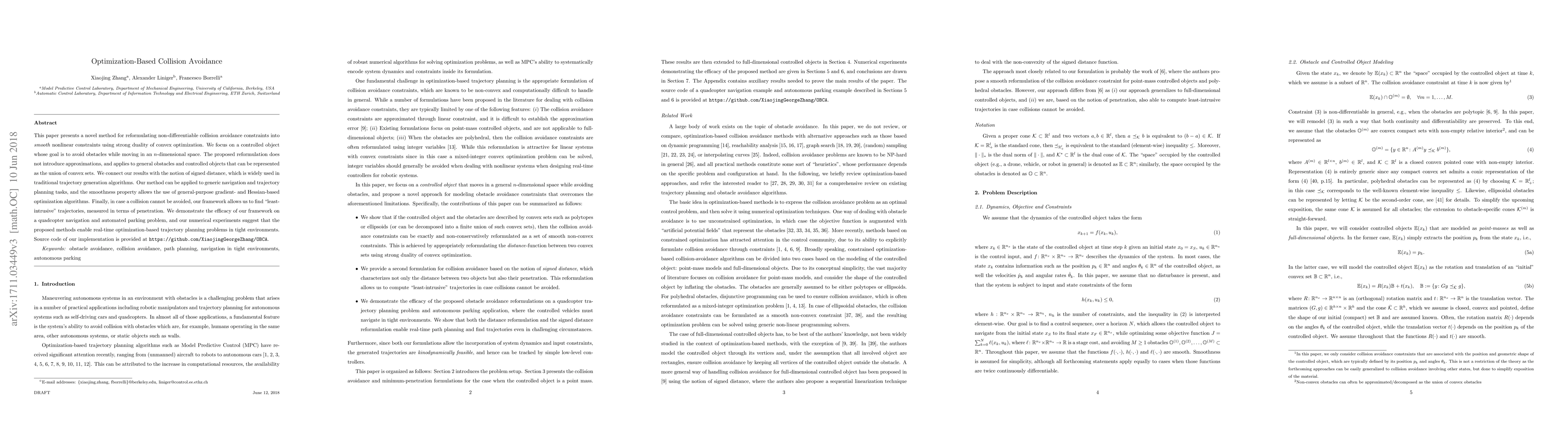 This paper introduces a method for converting non-differentiable collision avoidance constraints into smooth nonlinear constraints using convex optimization, enabling real-time optimization-based trajectory planning in n-dimensional spaces. The approach is demonstrated effectively in quadcopter navigation and automated parking.