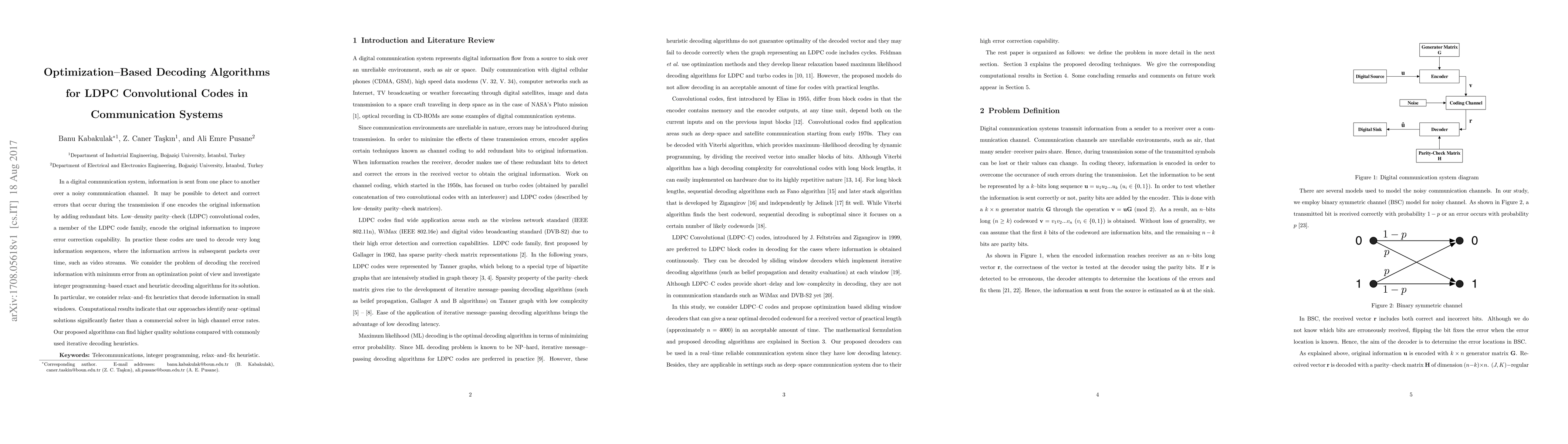In a digital communication system, information is sent from one place to another over a noisy communication channel. It may be possible to detect and correct errors that occur during the transmission if one encodes the original information by adding redundant bits. Low-density parity-check (LDPC) convolutional codes, a member of the LDPC code family, encode the original information to improve error correction capability. In practice these codes are used to decode very long information sequences, where the information arrives in subsequent packets over time, such as video streams. We consider the problem of decoding the received information with minimum error from an optimization point of view and investigate integer programming-based exact and heuristic decoding algorithms for its solution. In particular, we consider relax-and-fix heuristics that decode information in small windows. Computational results indicate that our approaches identify near-optimal solutions significantly faster than a commercial solver in high channel error rates. Our proposed algorithms can find higher quality solutions compared with commonly used iterative decoding heuristics.