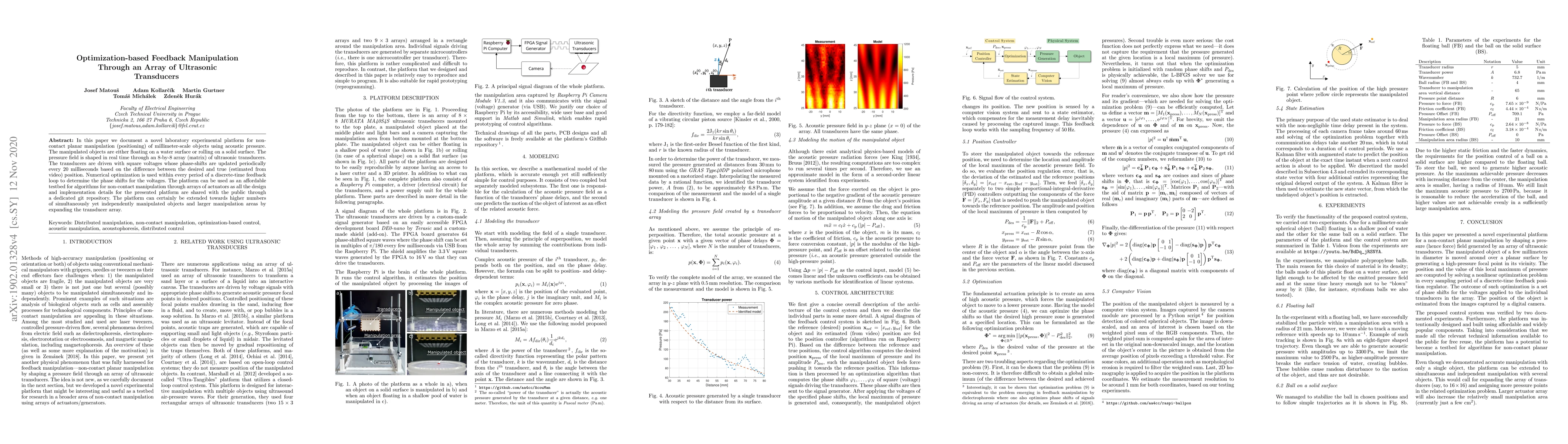In this paper we document a novel laboratory experimental platform for non-contact planar manipulation (positioning) of millimeter-scale objects using acoustic pressure. The manipulated objects are either floating on a water surface or rolling on a solid surface. The pressure field is shaped in real time through an 8-by-8 array (matrix) of ultrasonic transducers. The transducers are driven with square voltages whose phase-shifts are updated periodically every few milliseconds based on the difference between the desired and true (estimated from video) position. Numerical optimization is used within every period of a discrete-time feedback loop to determine the phase shifts for the voltages. The platform can be used as an affordable testbed for algorithms for non-contact manipulation through arrays of actuators as all the design and implementation details for the presented platform are shared with the public through a dedicated git repository. The platform can certainly be extended towards higher numbers of simultaneously yet independently manipulated objects and larger manipulation areas by the expanding the transducer array.