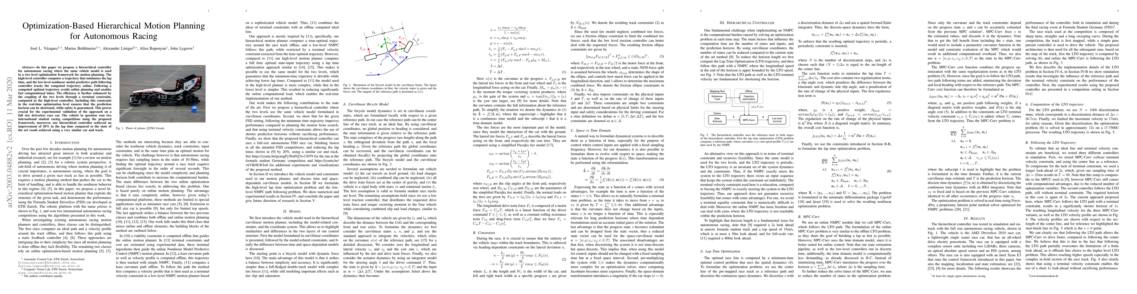 This paper introduces a hierarchical motion planning system for autonomous racing, utilizing a two-level optimization framework that significantly reduces lap time. The high-level controller computes an optimal trajectory, while the low-level controller follows it, ensuring safety and efficiency through a terminal constraint. The approach was validated on a full-size driverless race car, winning two competitions and achieving a 20% improvement over the previous state of the art.
