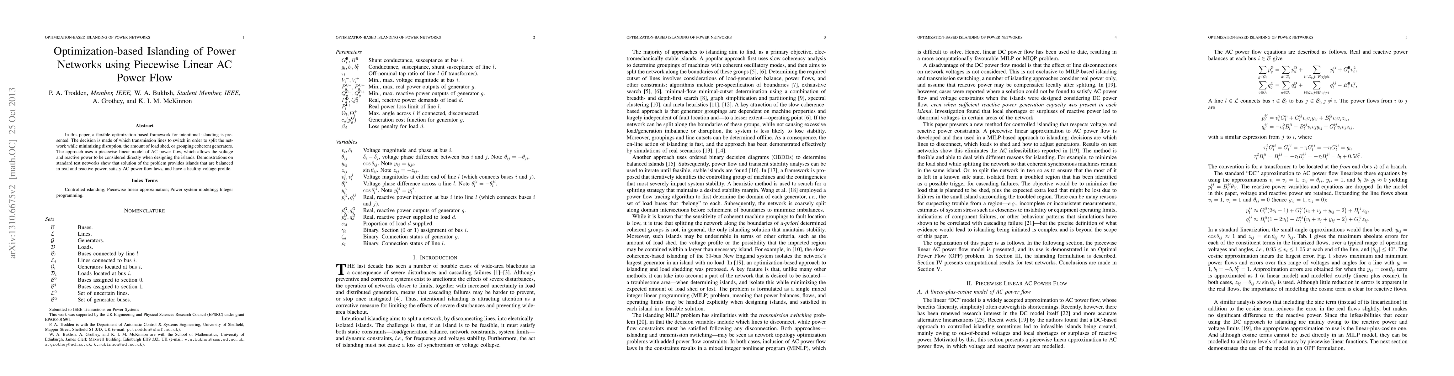 This paper proposes an optimization-based framework for intentional islanding of power networks using a piecewise linear AC power flow model, aiming to minimize disruption and load shedding. The method results in balanced, healthy islands that satisfy AC power flow laws and voltage profiles.