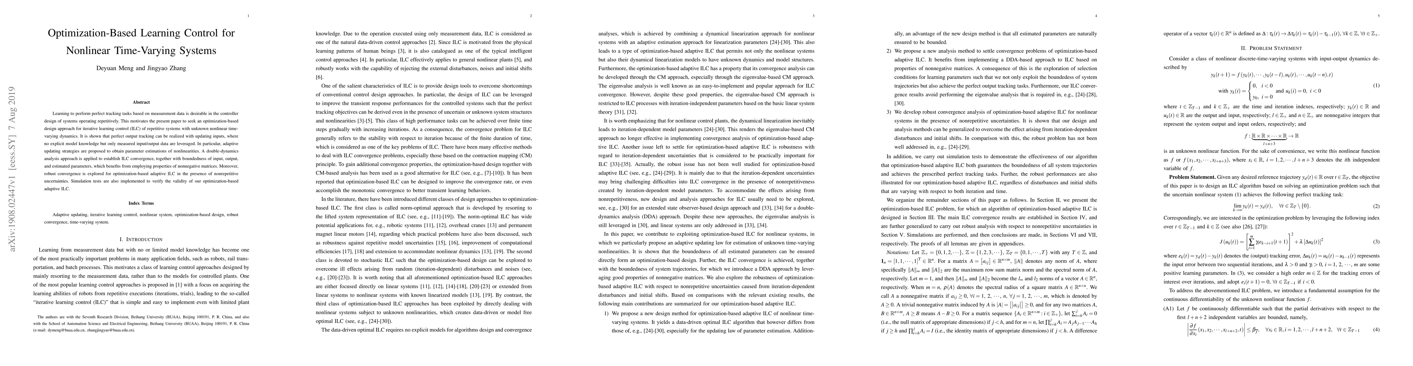 This paper proposes an optimization-based iterative learning control (ILC) approach for nonlinear time-varying systems, achieving perfect output tracking through adaptive updating strategies without explicit model knowledge. The method ensures robust convergence and boundedness of inputs, outputs, and parameters using double-dynamics analysis and properties of nonnegative matrices.