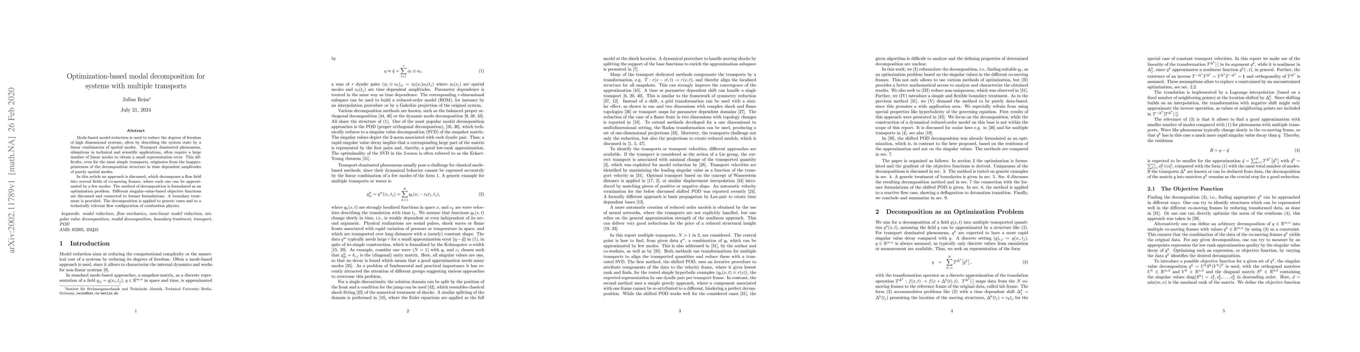 Mode-based model-reduction is used to reduce the degrees of freedom of high dimensional systems, often by describing the system state by a linear combination of spatial modes. Transport dominated phenomena, ubiquitous in technical and scientific applications, often require a large number of linear modes to obtain a small representation error. This difficulty, even for the most simple transports, originates from the inappropriateness of the decomposition structure in time dependent amplitudes of purely spatial modes. In this article an approach is discussed, which decomposes a flow field into several fields of co-moving frames, where each one can be approximated by a few modes. The method of decomposition is formulated as an optimization problem. Different singular-value-based objective functions are discussed and connected to former formulations. A boundary treatment is provided. The decomposition is applied to generic cases and to a technically relevant flow configuration of combustion physics.