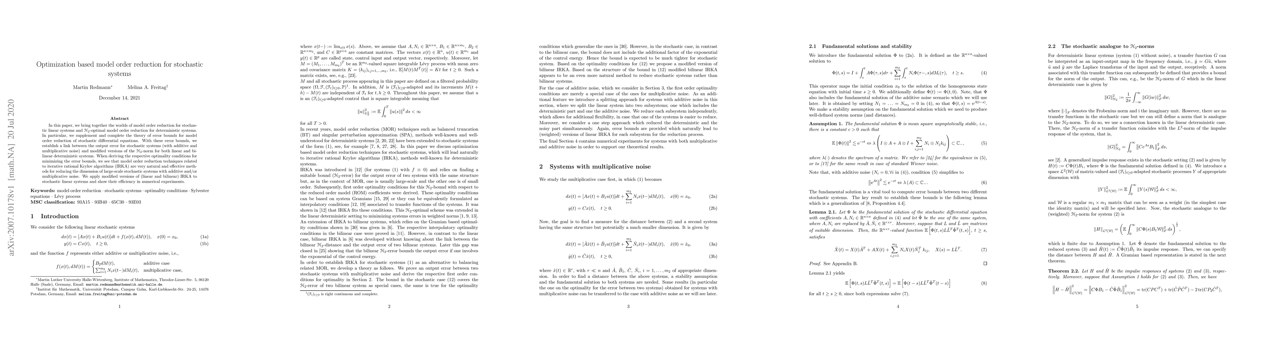 The paper presents an optimization-based model order reduction approach for stochastic systems, linking output error bounds with modified H₂-norms for deterministic systems, and proposes an efficient algorithm based on iterative rational Krylov methods.