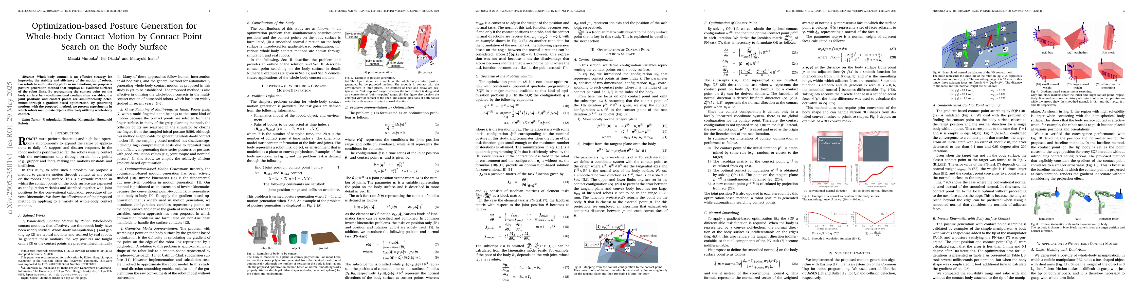 The paper presents an optimization-based posture generation method that simultaneously determines joint positions and contact points on the body surface using gradient-based optimization, facilitating whole-body contact motions in robots.