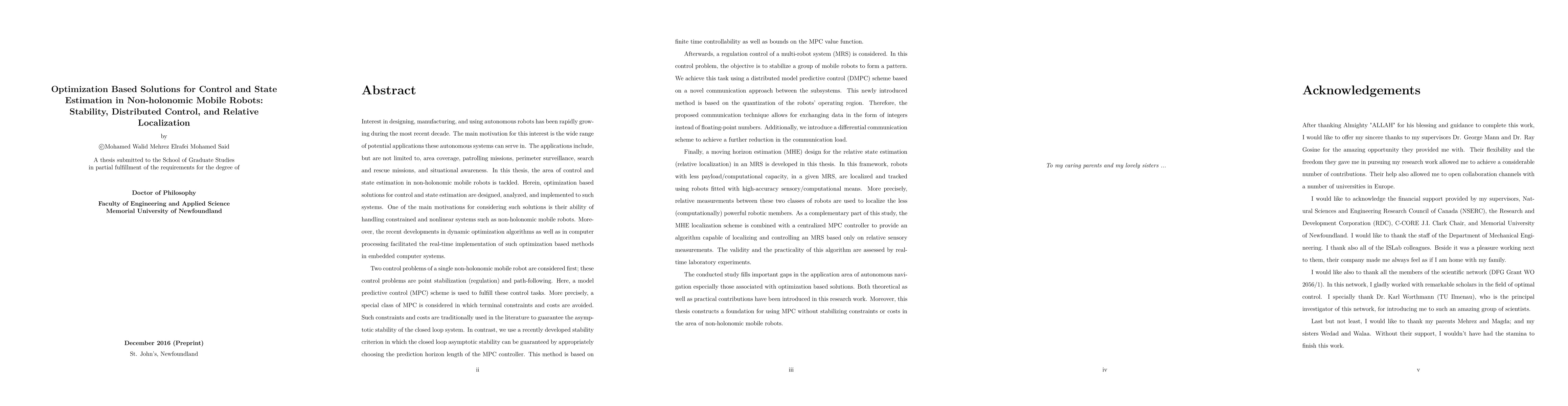 This paper explores optimization-based solutions for control and state estimation in non-holonomic mobile robots, focusing on stability, distributed control, and relative localization. It leverages recent advancements in dynamic optimization and computational power to implement these methods in real-time for autonomous robot applications.