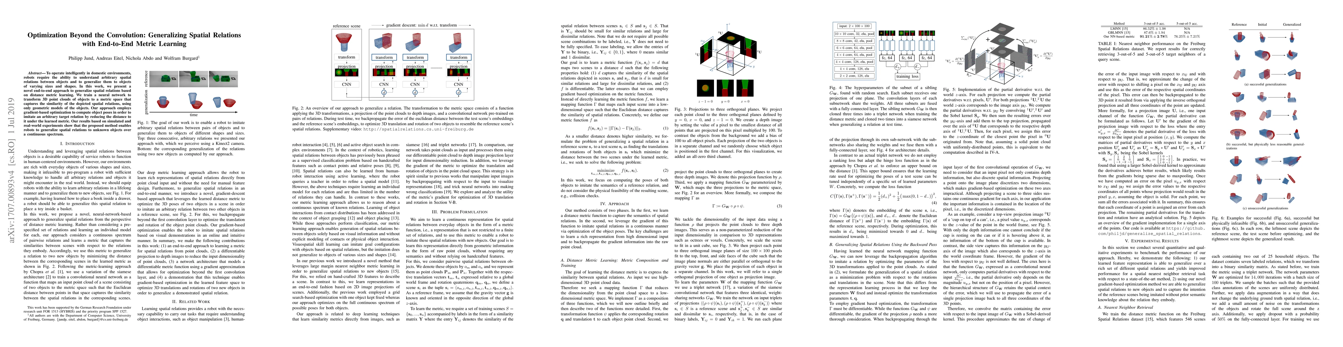 This paper proposes an end-to-end metric learning approach to enable robots to generalize spatial relations between objects using 3D point clouds. The method transforms objects into a metric space that captures spatial similarity, allowing robots to understand and imitate arbitrary spatial relations with unknown objects.