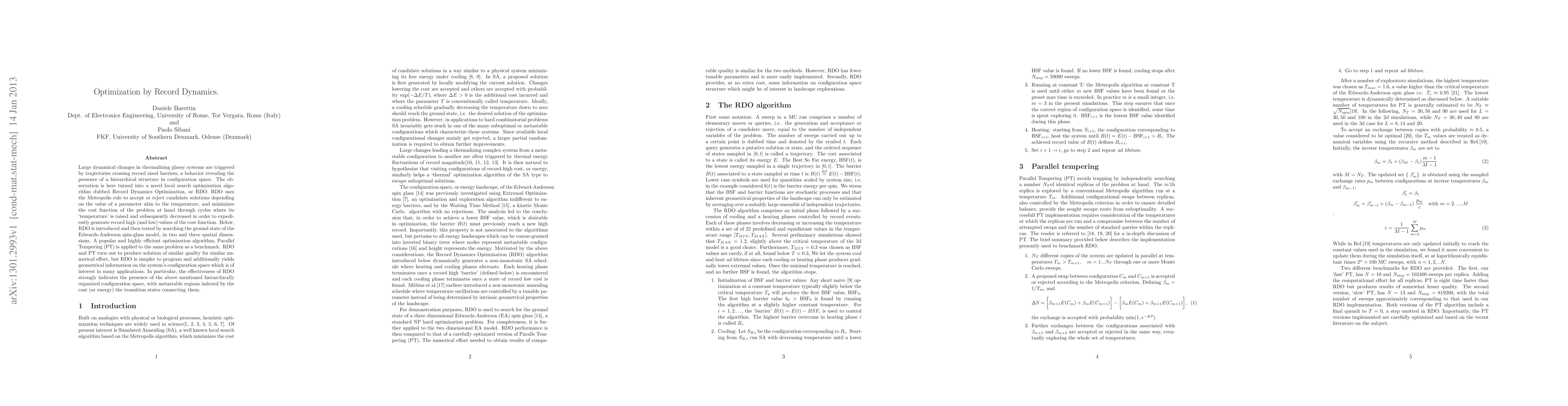 The paper introduces Record Dynamics Optimization (RDO), a novel local search algorithm inspired by the dynamics of record-sized barriers in glassy systems, which uses cycles of temperature changes to efficiently find optimal solutions. RDO compares favorably with Parallel Tempering, showing similar solution quality and simplicity, while also providing geometrical insights into the configuration space.