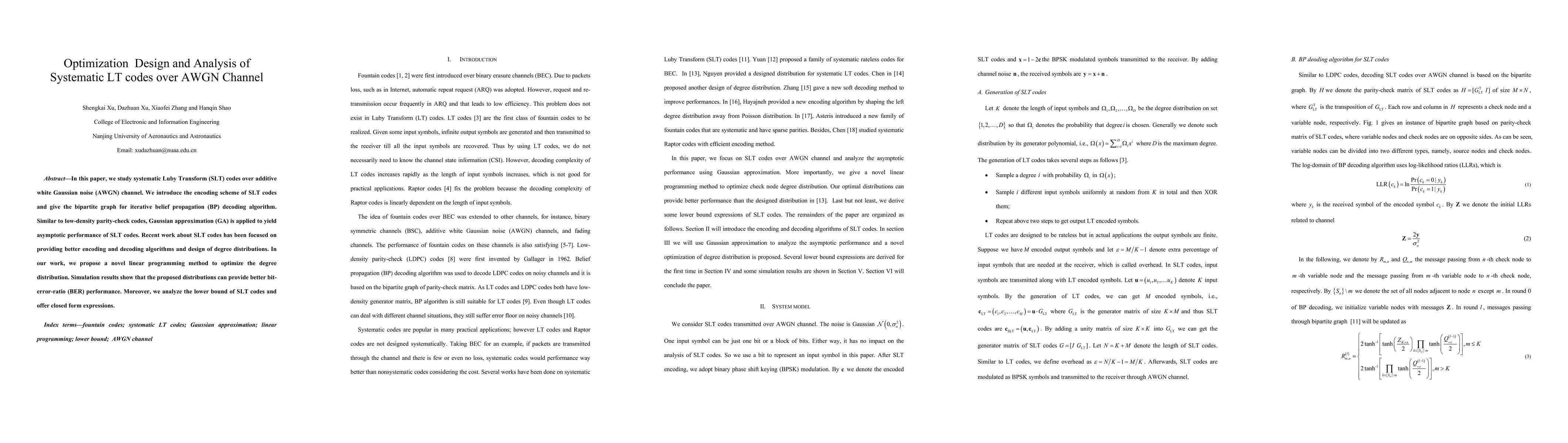 This research introduces an optimization design for Systematic Luby Transform (SLT) codes over the Additive White Gaussian Noise (AWGN) channel using a novel linear programming method. The method improves degree distribution for better Bit-Error-Ratio (BER) performance, with simulation results supporting this claim. The paper also provides closed form expressions for the lower bound analysis of SLT codes.