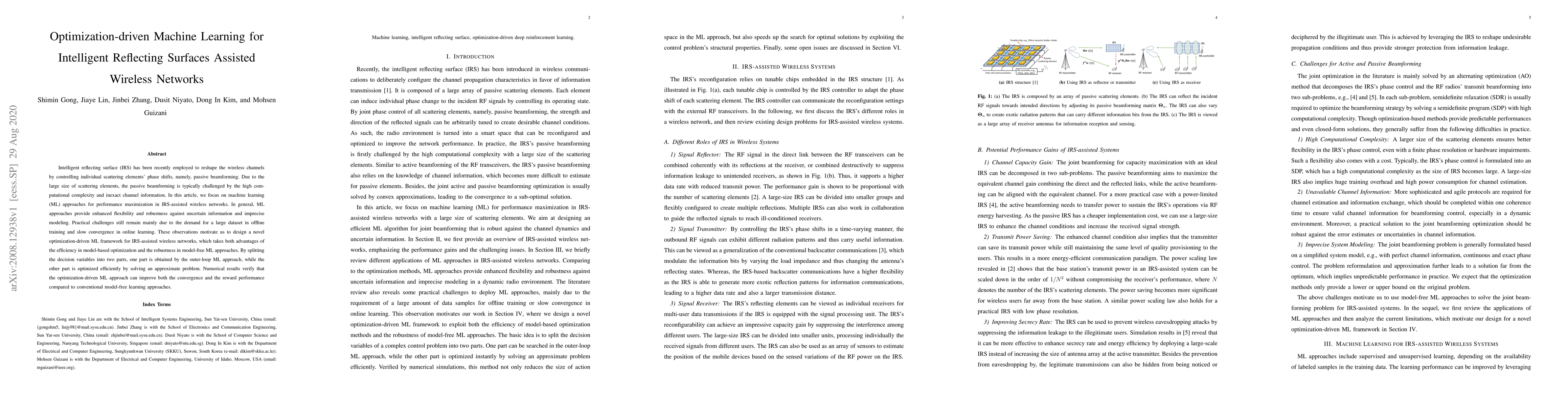This paper proposes an optimization-driven machine learning framework for intelligent reflecting surfaces (IRS) to enhance wireless network performance, combining model-based optimization for efficiency and model-free learning for robustness. The approach splits decision variables to improve both convergence and reward performance over conventional methods.