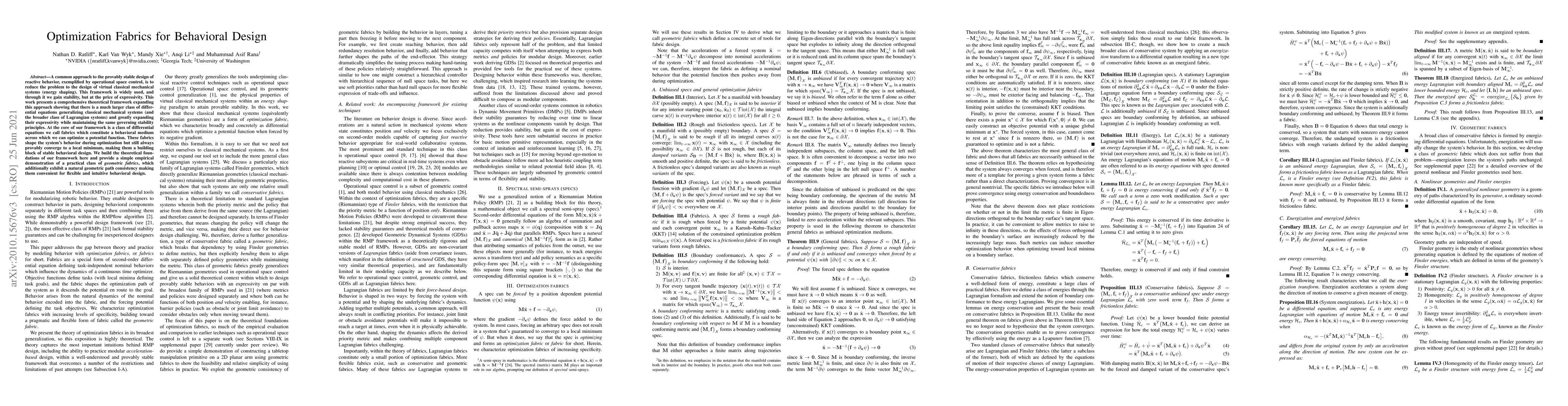 A common approach to the provably stable design of reactive behavior, exemplified by operational space control, is to reduce the problem to the design of virtual classical mechanical systems (energy shaping). This framework is widely used, and through it we gain stability, but at the price of expressivity. This work presents a comprehensive theoretical framework expanding this approach showing that there is a much larger class of differential equations generalizing classical mechanical systems (and the broader class of Lagrangian systems) and greatly expanding their expressivity while maintaining the same governing stability principles. At the core of our framework is a class of differential equations we call fabrics which constitute a behavioral medium across which we can optimize a potential function. These fabrics shape the system's behavior during optimization but still always provably converge to a local minimum, making them a building block of stable behavioral design. We build the theoretical foundations of our framework here and provide a simple empirical demonstration of a practical class of geometric fabrics, which additionally exhibit a natural geometric path consistency making them convenient for flexible and intuitive behavioral design.