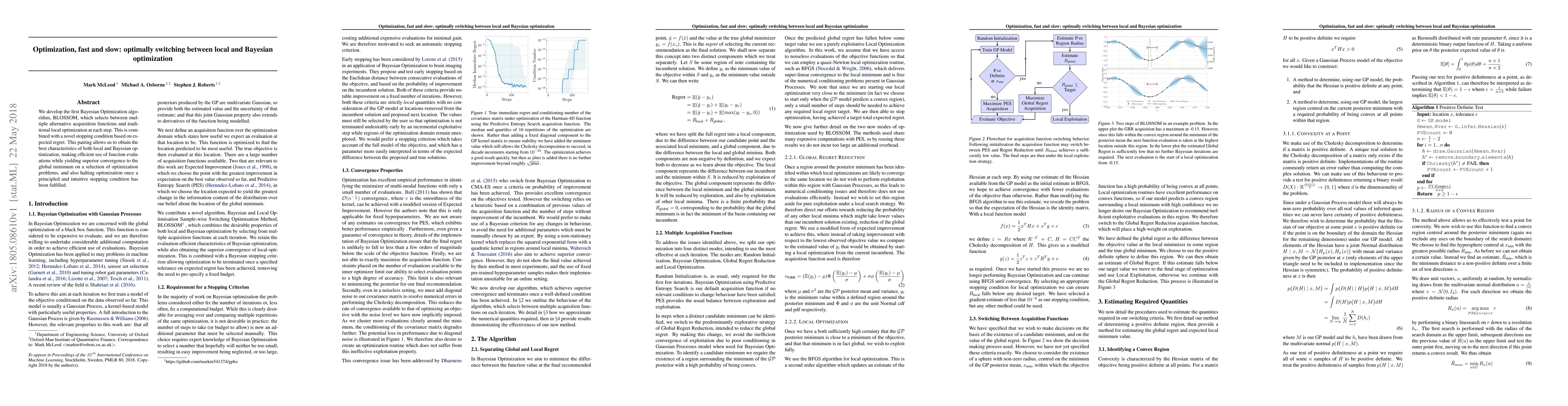 We develop the first Bayesian Optimization algorithm, BLOSSOM, which selects between multiple alternative acquisition functions and traditional local optimization at each step. This is combined with a novel stopping condition based on expected regret. This pairing allows us to obtain the best characteristics of both local and Bayesian optimization, making efficient use of function evaluations while yielding superior convergence to the global minimum on a selection of optimization problems, and also halting optimization once a principled and intuitive stopping condition has been fulfilled.