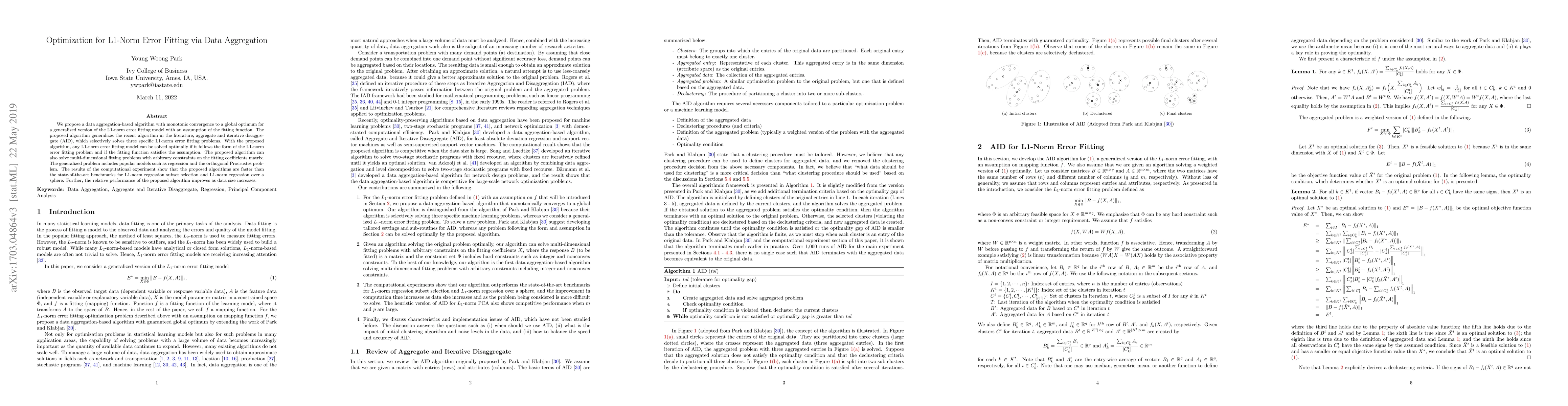 This paper proposes a data aggregation algorithm for L1-norm error fitting, achieving global optimum convergence and generalizing previous methods. The algorithm outperforms existing benchmarks in computational efficiency, especially with larger datasets.