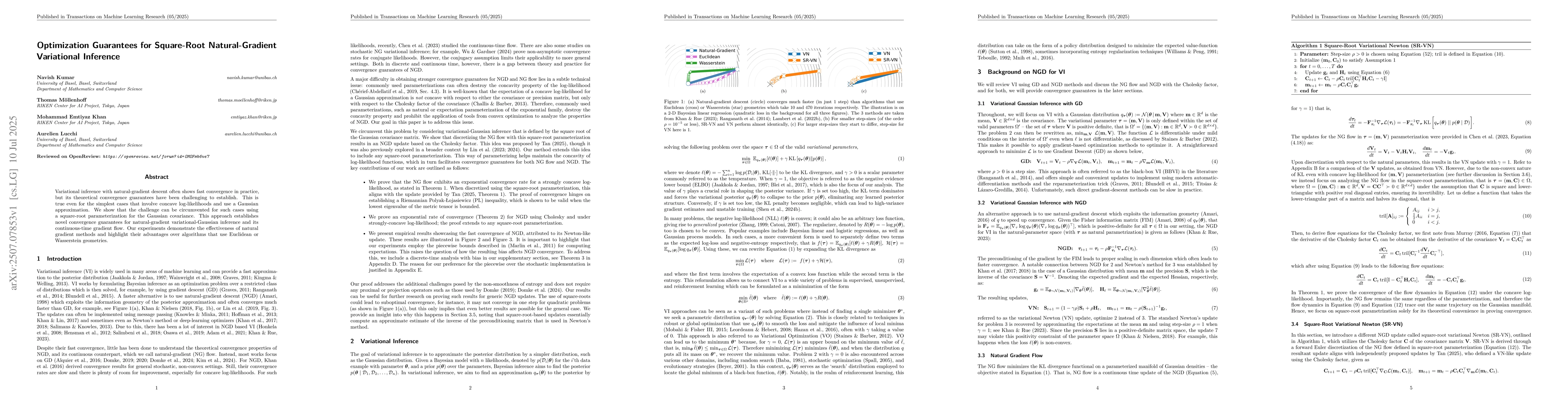 Variational inference with natural-gradient descent often shows fast convergence in practice, but its theoretical convergence guarantees have been challenging to establish. This is true even for the simplest cases that involve concave log-likelihoods and use a Gaussian approximation. We show that the challenge can be circumvented for such cases using a square-root parameterization for the Gaussian covariance. This approach establishes novel convergence guarantees for natural-gradient variational-Gaussian inference and its continuous-time gradient flow. Our experiments demonstrate the effectiveness of natural gradient methods and highlight their advantages over algorithms that use Euclidean or Wasserstein geometries.