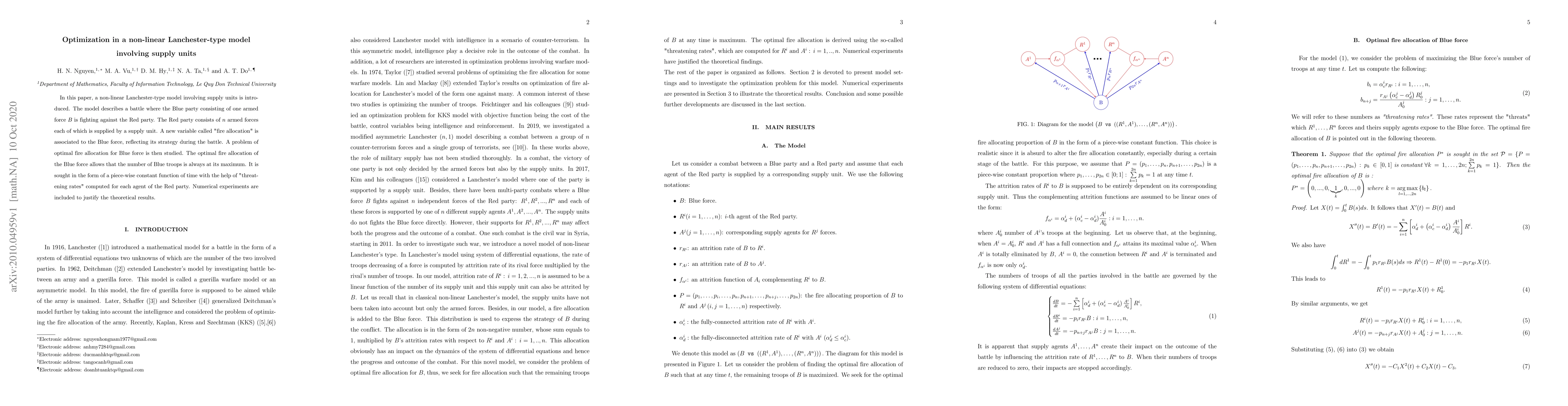 A non-linear Lanchester-type model involving supply units is introduced to optimize fire allocation for a Blue force in battle against a Red party with n armed forces, finding the optimal strategy using piece-wise constant functions and threatening rates.