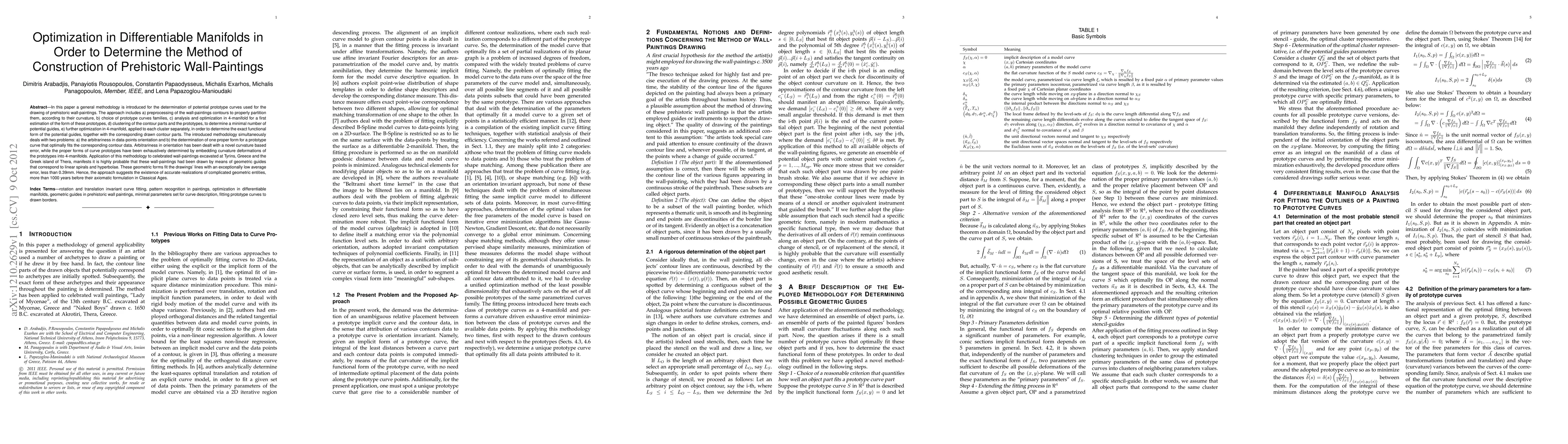 In this paper a general methodology is introduced for the determination of potential prototype curves used for the drawing of prehistoric wall-paintings. The approach includes a) preprocessing of the wall-paintings contours to properly partition them, according to their curvature, b) choice of prototype curves families, c) analysis and optimization in 4-manifold for a first estimation of the form of these prototypes, d) clustering of the contour parts and the prototypes, to determine a minimal number of potential guides, e) further optimization in 4-manifold, applied to each cluster separately, in order to determine the exact functional form of the potential guides, together with the corresponding drawn contour parts. The introduced methodology simultaneously deals with two problems: a) the arbitrariness in data-points orientation and b) the determination of one proper form for a prototype curve that optimally fits the corresponding contour data. Arbitrariness in orientation has been dealt with a novel curvature based error, while the proper forms of curve prototypes have been exhaustively determined by embedding curvature deformations of the prototypes into 4-manifolds. Application of this methodology to celebrated wall-paintings excavated at Tyrins, Greece and the Greek island of Thera, manifests it is highly probable that these wall-paintings had been drawn by means of geometric guides that correspond to linear spirals and hyperbolae. These geometric forms fit the drawings' lines with an exceptionally low average error, less than 0.39mm. Hence, the approach suggests the existence of accurate realizations of complicated geometric entities, more than 1000 years before their axiomatic formulation in Classical Ages.