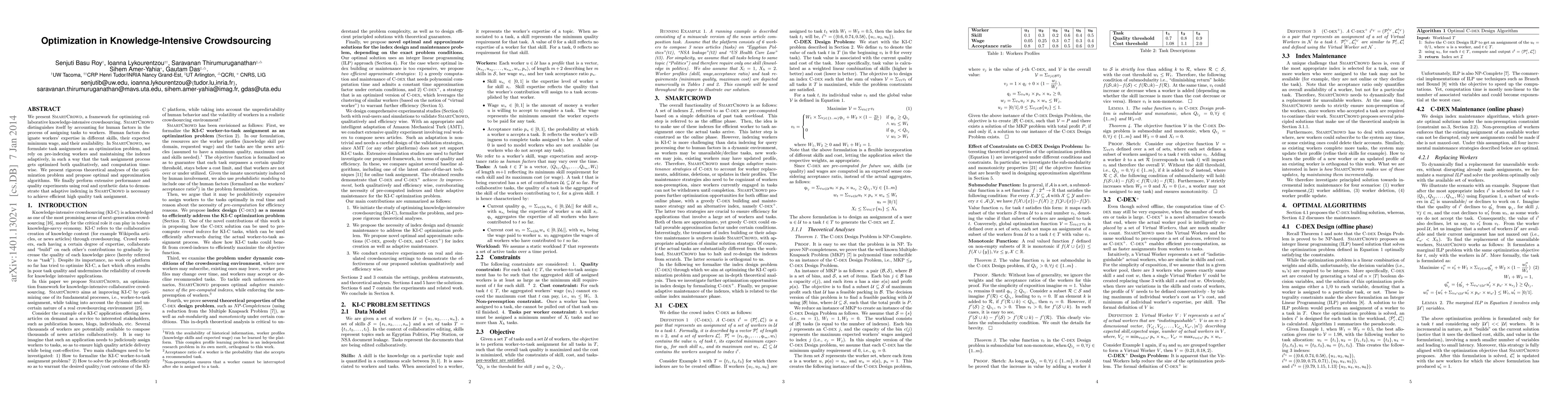 We present SmartCrowd, a framework for optimizing collaborative knowledge-intensive crowdsourcing. SmartCrowd distinguishes itself by accounting for human factors in the process of assigning tasks to workers. Human factors designate workers' expertise in different skills, their expected minimum wage, and their availability. In SmartCrowd, we formulate task assignment as an optimization problem, and rely on pre-indexing workers and maintaining the indexes adaptively, in such a way that the task assignment process gets optimized both qualitatively, and computation time-wise. We present rigorous theoretical analyses of the optimization problem and propose optimal and approximation algorithms. We finally perform extensive performance and quality experiments using real and synthetic data to demonstrate that adaptive indexing in SmartCrowd is necessary to achieve efficient high quality task assignment.
