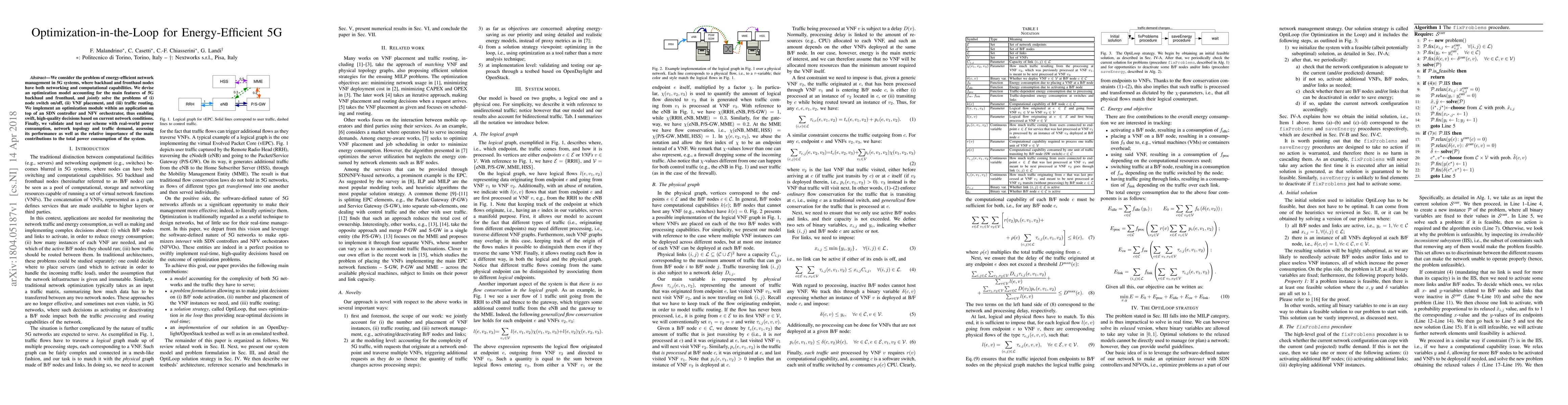 We consider the problem of energy-efficient network management in 5G systems, where backhaul and fronthaul nodes have both networking and computational capabilities. We devise an optimization model accounting for the main features of 5G backhaul and fronthaul, and jointly solve the problems of (i) node switch on/off, (ii) VNF placement, and (iii) traffic routing. We implement an optimization module within an application on top of an SDN controller and NFV orchestrator, thus enabling swift, high-quality decisions based on current network conditions. Finally, we validate and test our scheme with real-world power consumption, network topology and traffic demand, assessing its performance as well as the relative importance of the main contributions to the total power consumption of the system.